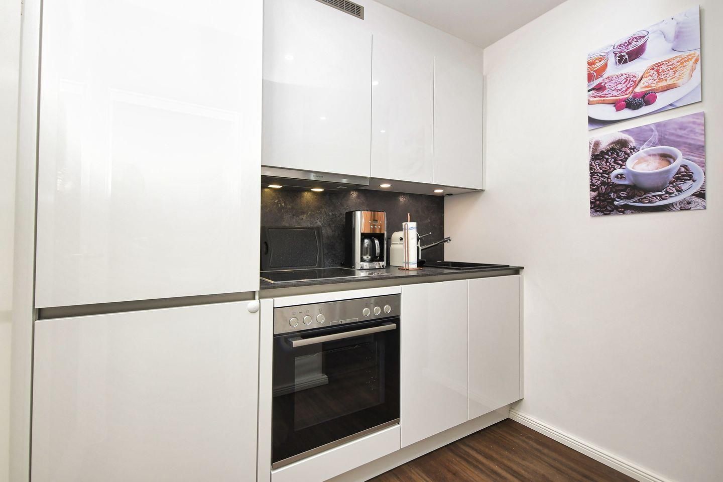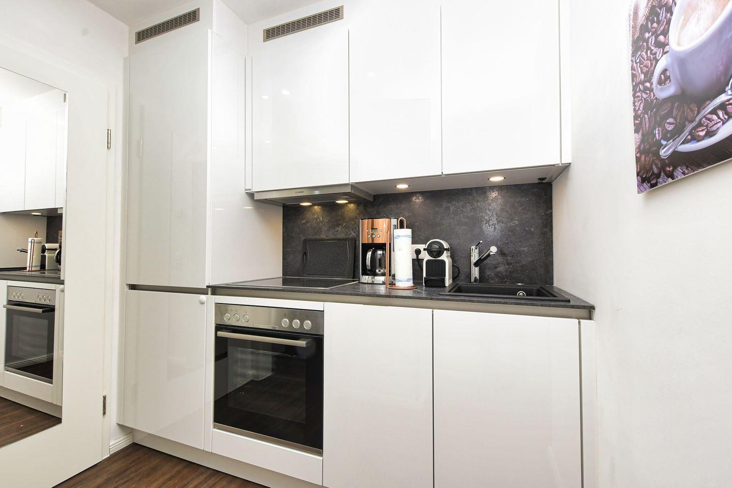 Die moderne Küche ist vollkommen ausgestattet, so dass Sie leckere Gerichte zubereiten können. Sie finden alles, was Sie benötigen: ein Cerankochfeld, einen Backofen, eine Spülmaschine, eine Mikrowelle und zahlreiche Küchenutensilien. Der angrenzende Essbereich mit Esstisch bietet den idealen Rahmen für gesellige Mahlzeiten.