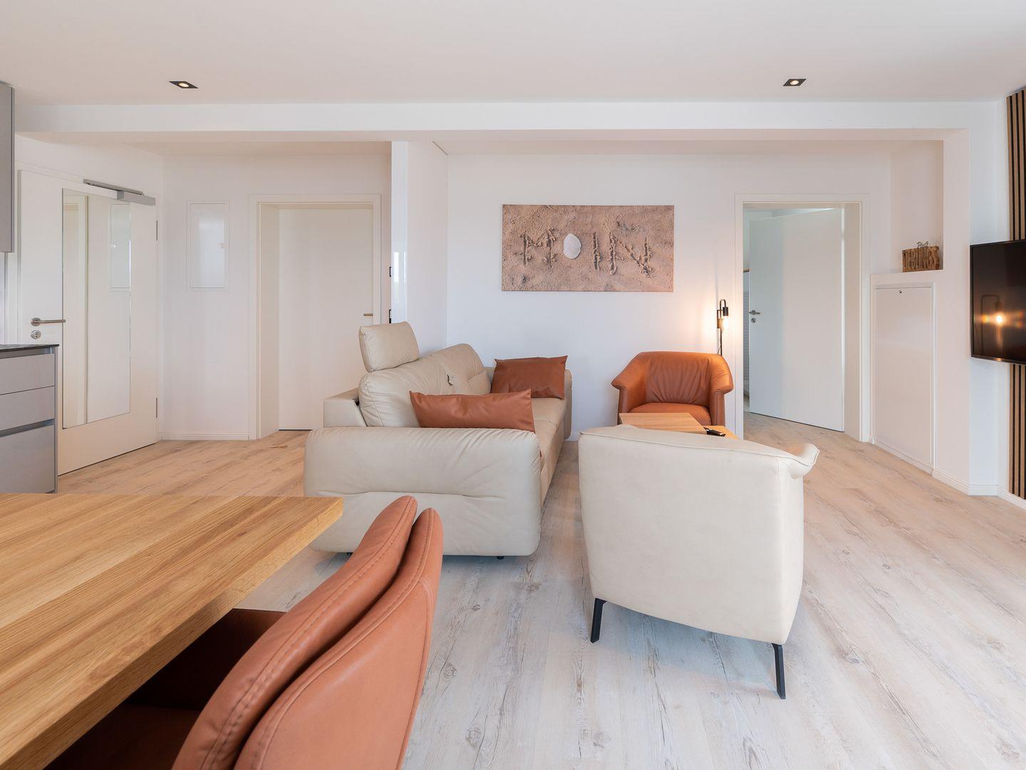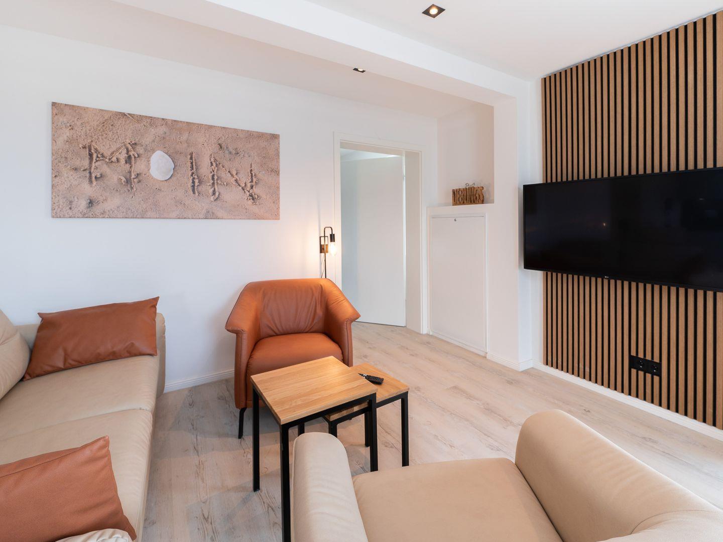 Das lichtdurchflutete Wohnzimmer ist der perfekte Ort, um sich nach einem ereignisreichen Tag zu entspannen. Die gemütliche Sofaecke lädt zum Verweilen ein, während drei Fernseher für Unterhaltung sorgen. Vom Wohnzimmer aus gelangen Sie auf den Balkon, wo Sie bei frischer Meeresluft den Alltag hinter sich lassen können.