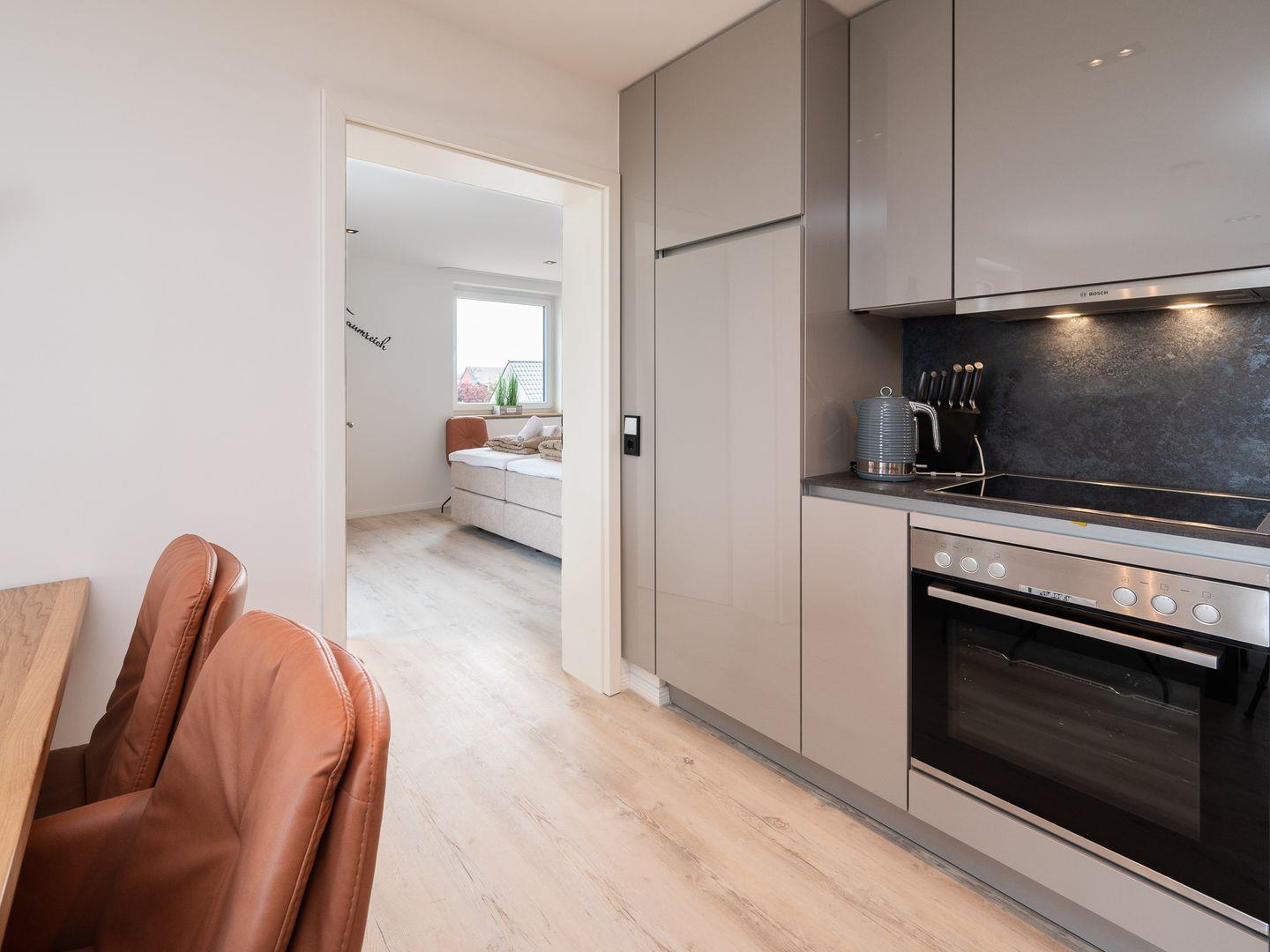 Die Wohnung befindet sich im zweiten Stock eines neu renovierten Gebäudes und ist bequem über einen Aufzug zu erreichen. Sie betreten die Wohnung durch einen einladenden Flur, von dem aus Sie in alle Räume gelangen können. Die offene Küche, ausgestattet mit hochwertigen Geräten wie einer Spülmaschine, einem Cerankochfeld und einer Nespresso-Maschine, erlaubt es Ihnen, kulinarische Köstlichkeiten zu zaubern. Hier haben Sie genügend Platz, um gemeinsam am Esstisch zu sitzen und Ihre Speisen zu genießen.