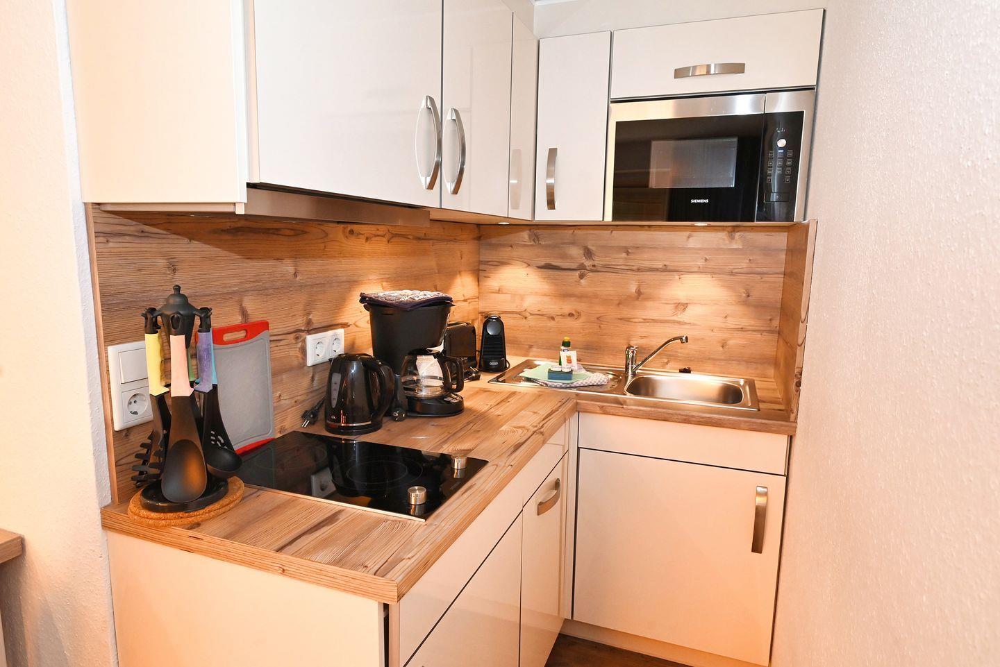 Die Wohnung verfügt über ein gemütliches Schlafzimmer, das mit einem komfortablen Bett ausgestattet ist und Platz für bis zu drei Personen bietet. Der offene Wohnbereich ist ideal zum Entspannen und lädt mit einem Sofa und einem Essbereich dazu ein, gemeinsame Mahlzeiten zu genießen. Eine gut ausgestattete Küchenzeile mit modernen Geräten wie einem Cerankochfeld, einer Mikrowelle und einer Spülmaschine sorgt dafür, dass Sie Ihre Lieblingsgerichte bequem zubereiten können. Selbstverständlich sind auch Geschirr und Besteck vorhanden.