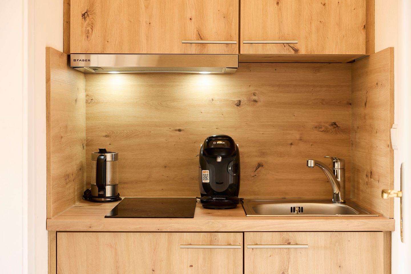 Ausstattung: Die Ferienunterkunft verfügt über ein gemütliches Zimmer mit Schlafmöglichkeiten für zwei Personen. Der helle Wohn- und Schlafbereich ist geschmackvoll eingerichtet und bietet einen Esstisch sowie eine Sitzecke, die zum Entspannen einlädt. Eine Kochnische mit Kühlschrank, Geschirr, Besteck und einer modernen Espressomaschine sorgt dafür, dass Sie sich auch selbst bewirten können, um die ersten Sonnenstrahlen des Tages mit einer selbstgemachten Tasse Kaffee zu genießen. Ein Balkon lädt zusätzlich dazu ein, den Blick in die Umgebung zu genießen.