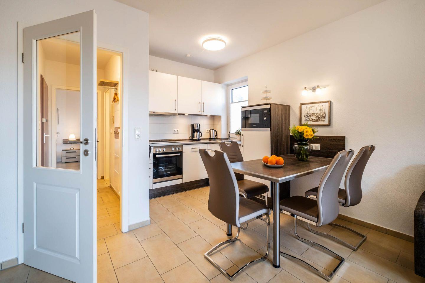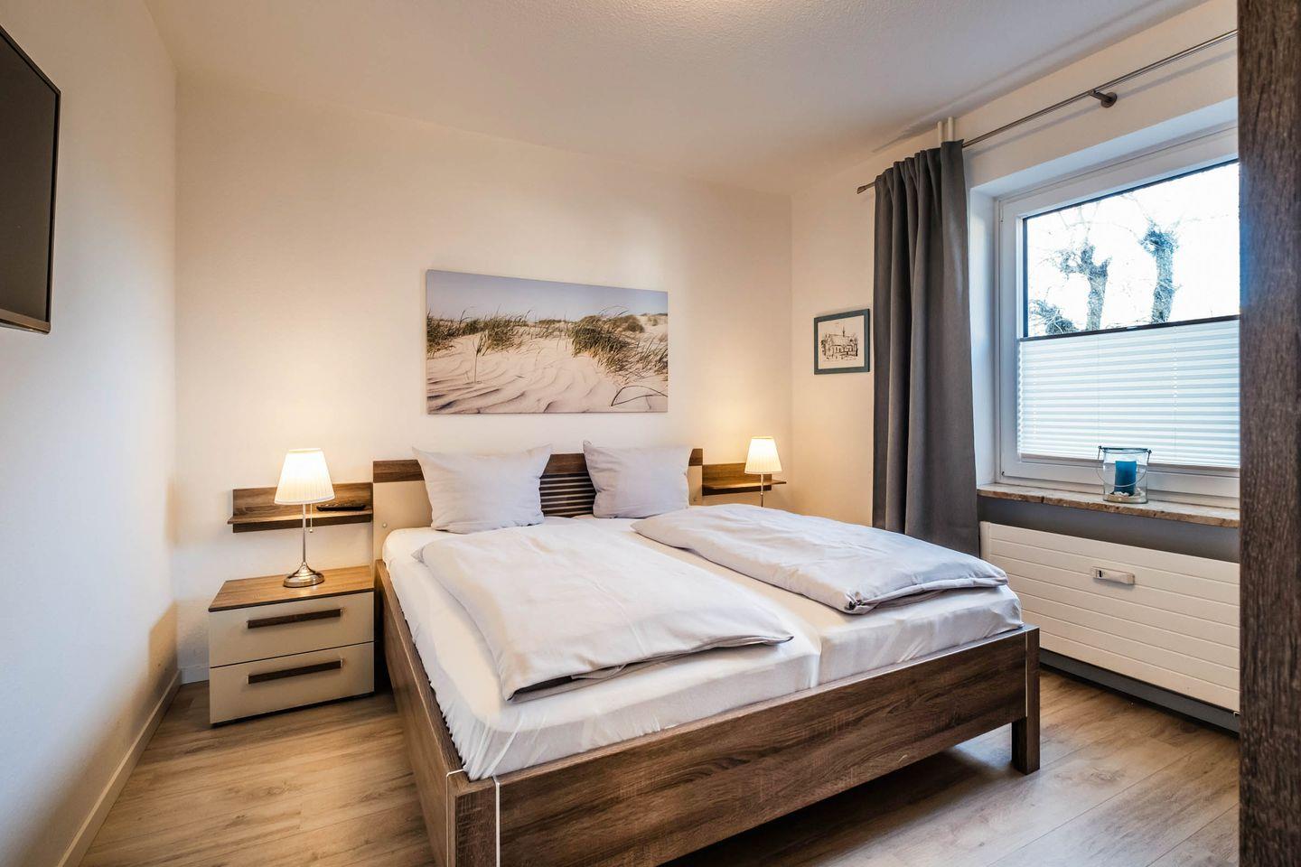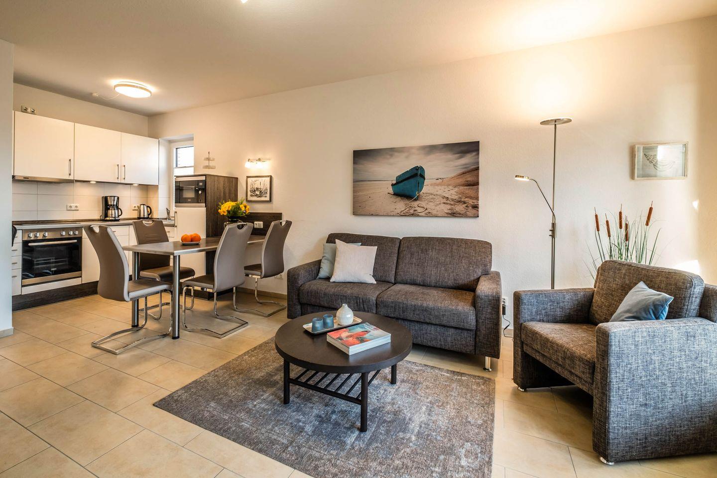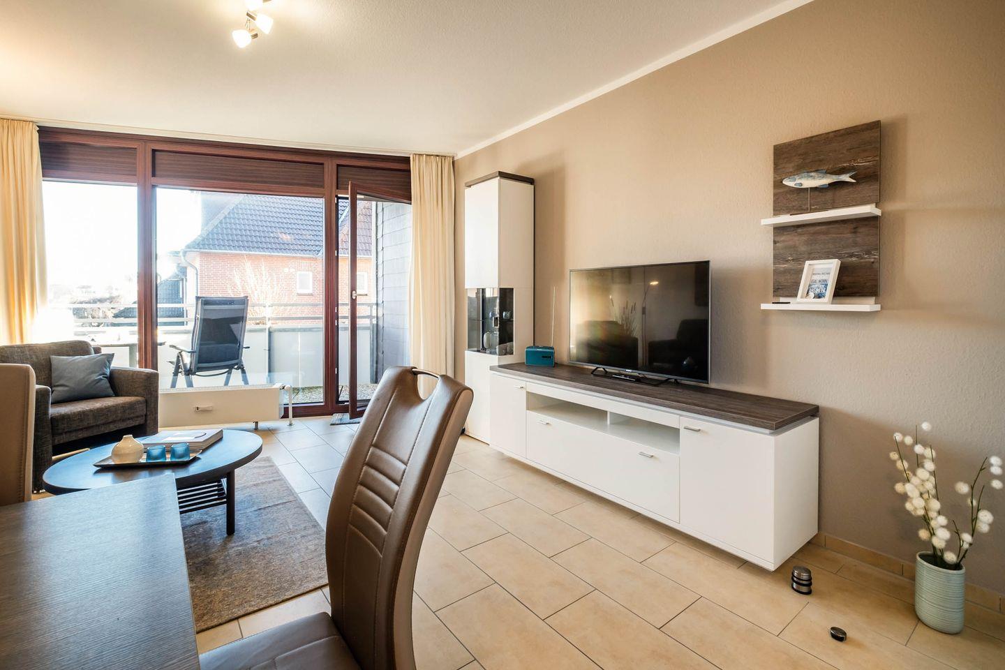 Die Wohnung besteht aus einem gemütlichen Schlafzimmer mit bequemen Schlafmöglichkeiten für bis zu zwei Personen und einem hellen, offenen Wohnbereich, der zum Entspannen einlädt. Der Wohnbereich ist mit einem Sofa und einem Esstisch ausgestattet, der genug Platz für gemeinsame Mahlzeiten bietet. Dank der großen Fenster können Sie die frische Nordseeluft hereinlassen und die Ausblicke auf die Umgebung genießen. Außerdem stehen Ihnen zwei Fernseher sowie eine HiFi-Stereoanlage mit CD, DAB+/FM-Radio, USB und Bluetooth + WLAN zur Verfügung, damit Sie während Ihres Aufenthalts stets unterhalten sind und mit Ihren Liebsten in Kontakt bleiben können.