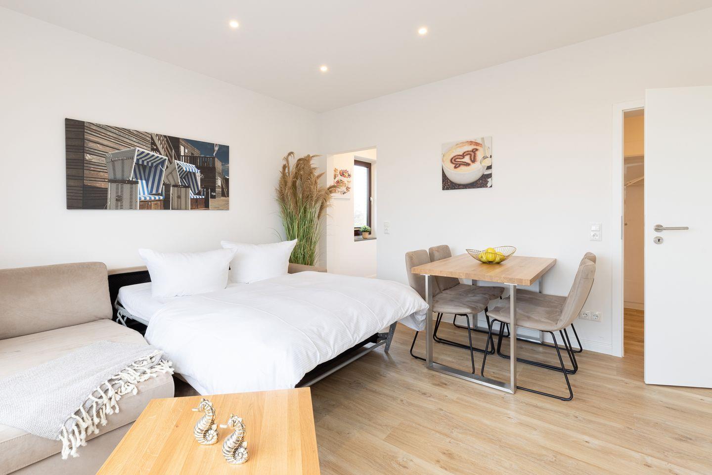 Die offene Kochnische bietet alles, was Sie für die Zubereitung Ihrer Lieblingsgerichte benötigen. Von der Mikrowelle über einen Kühlschrank mit Gefrierfach bis hin zur Kaffeemaschine und sogar einem Toaster – es fehlt Ihnen an nichts! Genießen Sie Ihre Mahlzeiten am Esstisch, während das sanfte Licht durch die Fenster strömt. Im Wohnbereich finden Sie eine gemütliche Sofaecke, die zum Entspannen einlädt, etwa mit einem guten Buch oder einem Filmabend – dafür stehen Ihnen gleich zwei Fernseher zur Verfügung.