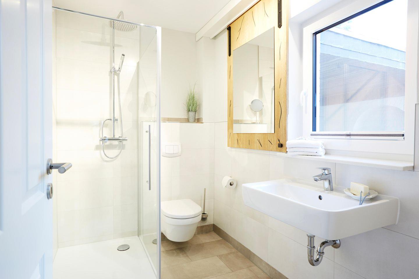 Das moderne tageslicht Badezimmer überzeugt durch eine bodengleiche Dusche, ein WC, Waschbecken und warmes Wasser. Hier finden Sie auch einen Haartrockner sowie einen großen Spiegel.