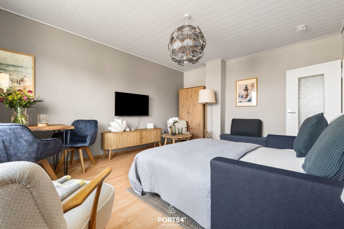 Die Ferienwohnung bietet auf einer Wohnfläche von 30 m² Platz für bis zu zwei Gäste und ist somit perfekt für einen romantischen Kurzurlaub oder eine kleine Auszeit. Der Wohnbereich besticht durch eine helle und freundliche Atmosphäre, die durch große Fenster und eine geschmackvolle Einrichtung geprägt ist. Eine Sofaecke sowie ein Sessel laden zum Entspannen ein, während ein Esstisch dafür sorgt, dass Sie auch in der Wohnung gemeinsam speisen können. Die kleine Küche ist gut ausgestattet und verfügt über einen 4-Plattenherd, Backofen, Kühlschrank mit Gefrierfach, Wasserkocher, Toaster und eine Filterkaffeemaschine, sodass Sie auch während Ihres Aufenthalts kulinarisch verwöhnt werden können.