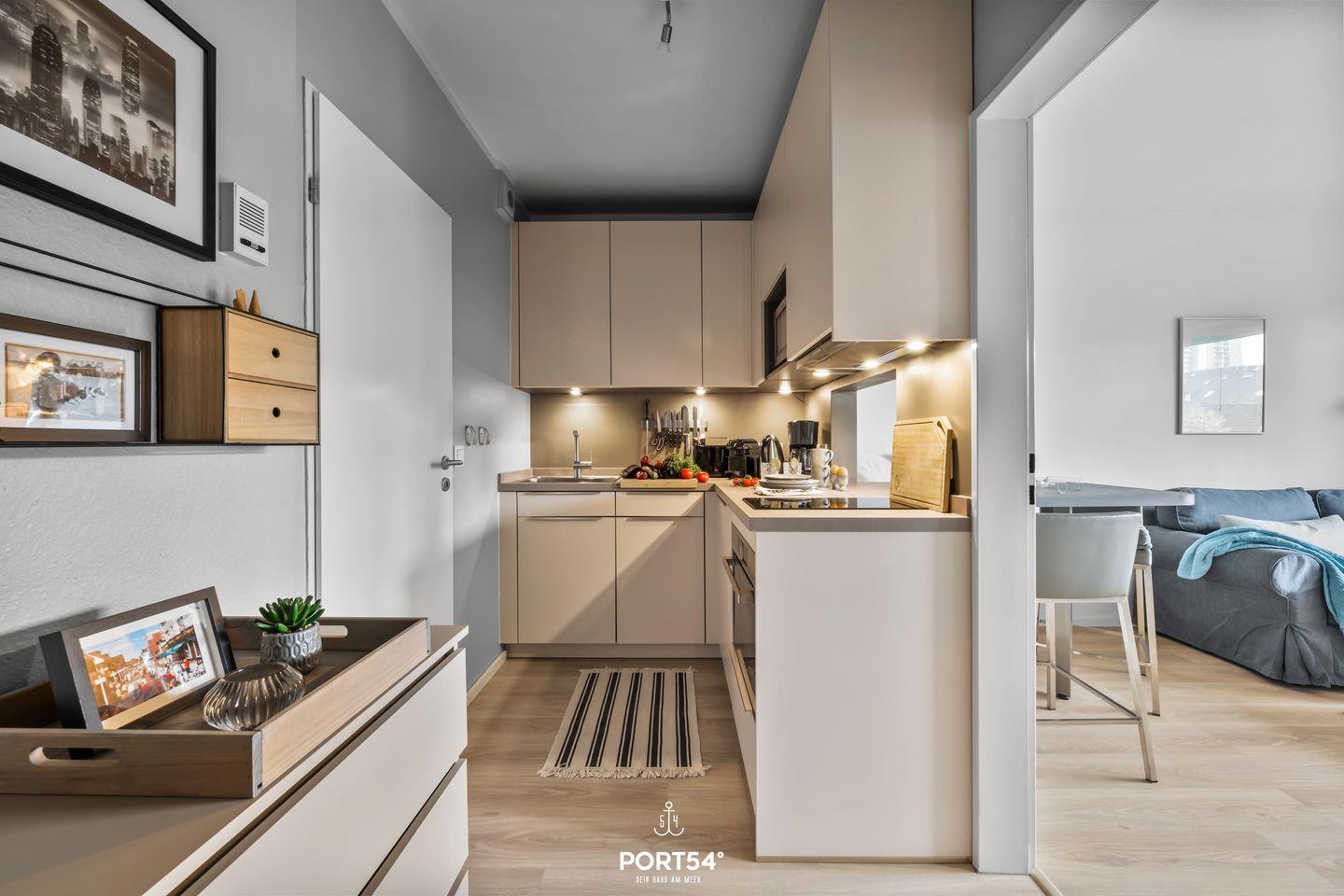 Die offene Küche ist zum Wohnzimmer hin gestaltet und ist mit hochwertigen Geräten ausgestattet. Hier finden Sie einen Induktionsherd, einen Backofen, einen Kühlschrank mit Gefrierfach sowie eine Espressomaschine und weitere Küchenutensilien, die es Ihnen ermöglichen, schmackhafte Mahlzeiten zuzubereiten. Der Essbereich mit einem Esstisch und bequemen Stühlen lädt zu gemeinsamen Mahlzeiten ein. Zudem ist die Ferienwohnung mit einem SmartTV und kostenlosem WLAN ausgestattet, sodass Sie auch während Ihres Aufenthalts online bleiben können.