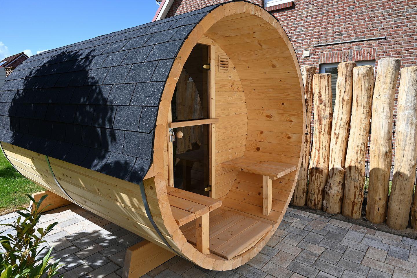 Ein finnisches Saunafass ( gemeinschaftliche Nutzung ) steht im Garten für Sie bereit.