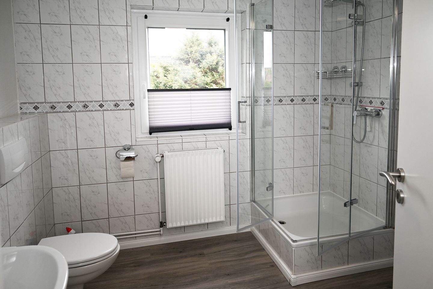 Das helle Badezimmer ist mit einer Dusche ausgestattet.
