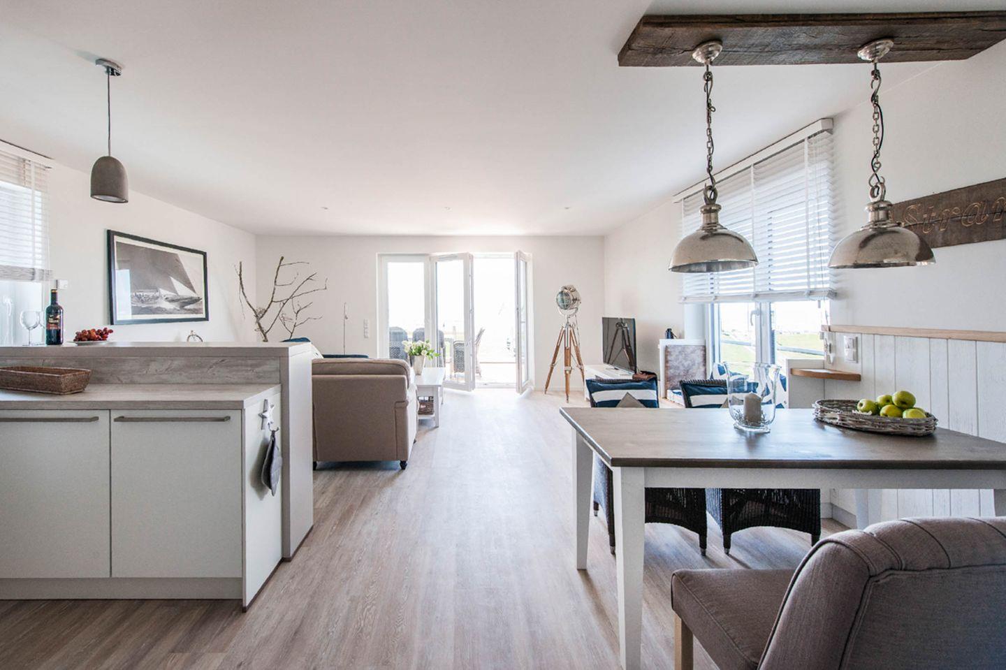 Die Ferienwohnung 3.1 ist eine mit viel Liebe eingerichtete und gemütliche 3-Raum-Wohnung mit einem 20 m² großen Balkon. Die Küchenzeile und der Essbereich sind direkt im Wohnbereich integriert. Die beiden Bäder verfügen über ebenerdige Duschen, Handtuchtrockner und Haar-Föhn. In einem der Bäder befindet sich eine Sauna. Vom Wohnbereich gelangen Sie direkt auf den Balkon.