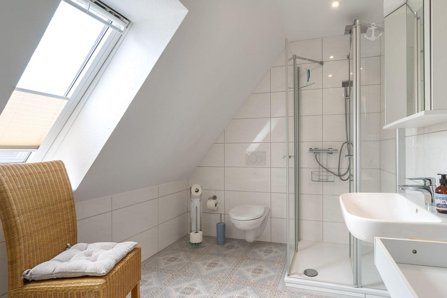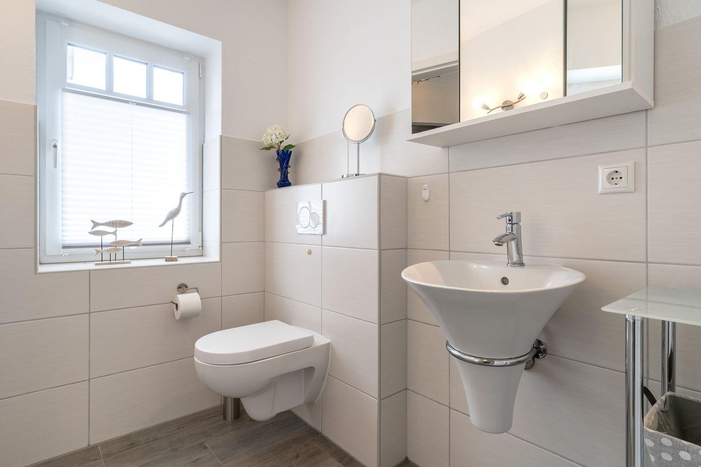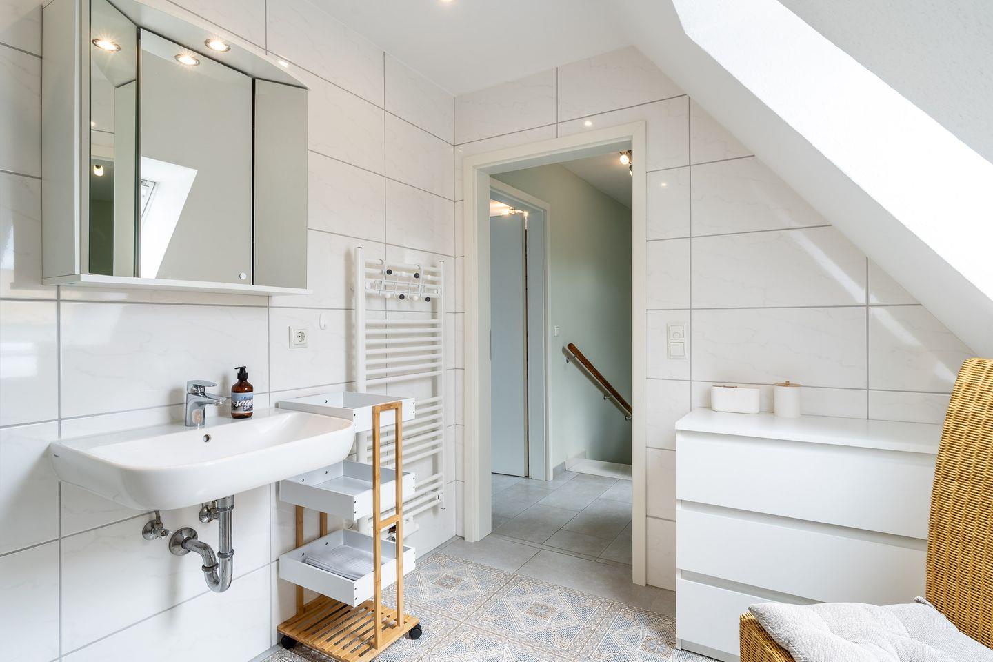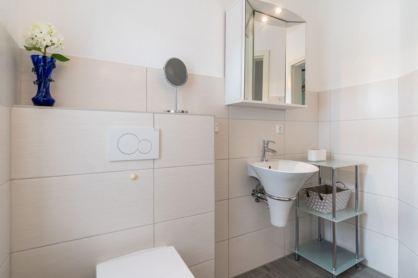 Die Unterkunft bietet ein modernes Badezimmer mit bodengleicher Dusche, Waschbecken, WC und Kosmetikspiegel. Ein Gäste-WC steht ebenfalls zur Verfügung. Für zusätzlichen Komfort sorgen ein Haartrockner und ein Wäscheständer. Dank der durchdachten Ausstattung wie Fliegengitter, Fenster mit Sichtschutz, Rauchmelder und einem praktischen Schuhschrank fühlen Sie sich schnell wohl und sicher.