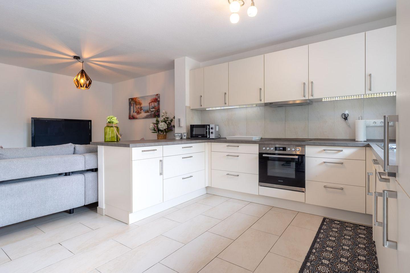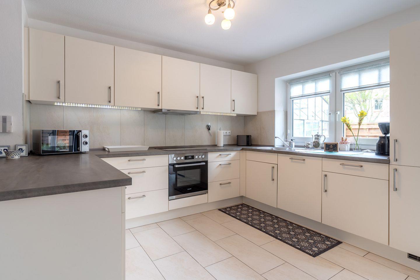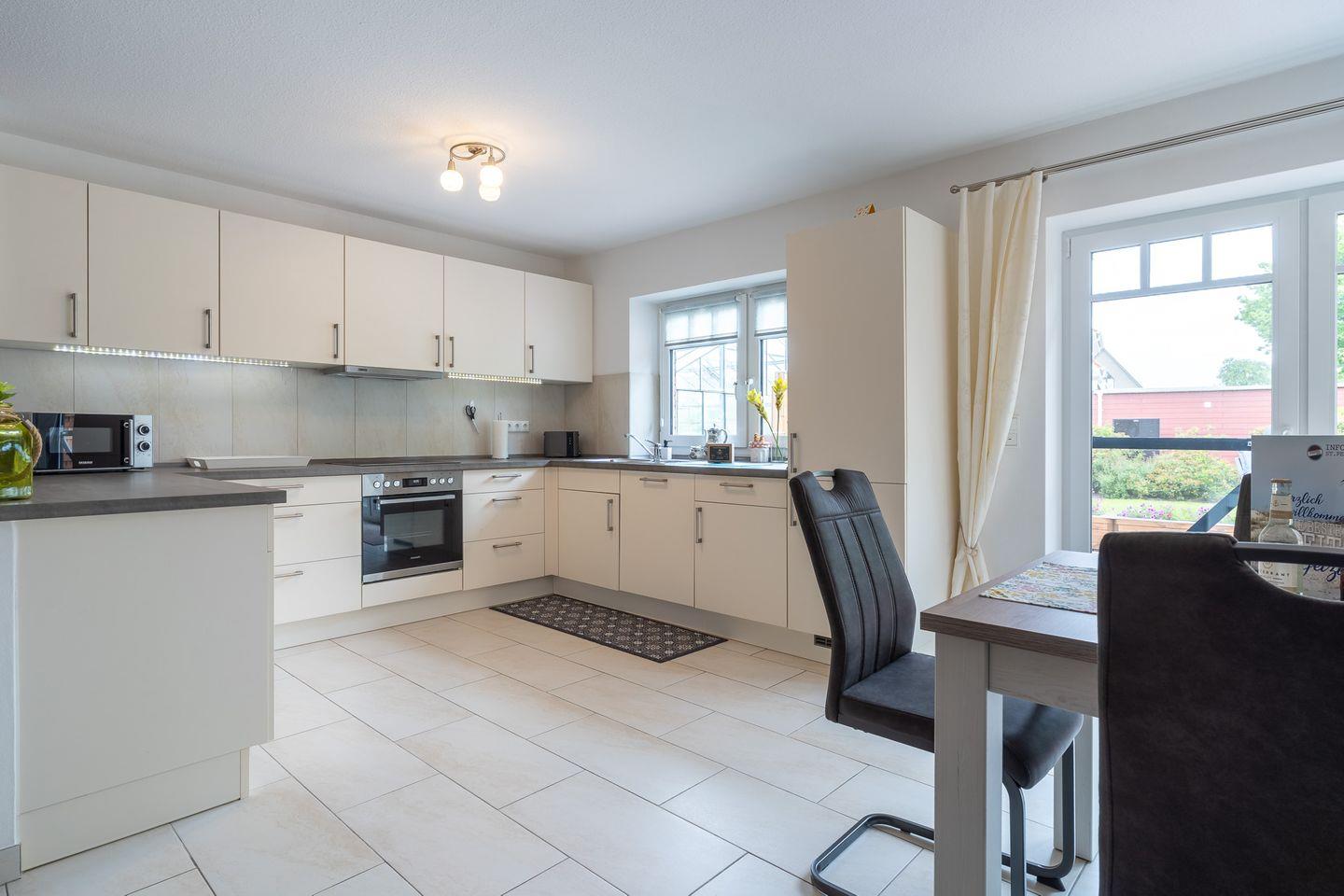 Die moderne, offene Küche ist mit hochwertigem Equipment ausgestattet, einschließlich eines Ceranherds, Backofens, Kühlschranks sowie Geschirrspüler. Sie finden auch nützliche Küchenutensilien wie Kaffeemaschine, Mikrowelle, Toaster und Mixer vor, die Ihnen die Vorbereitungen für schmackhafte Mahlzeiten erleichtern. Für größere Gruppen steht ein Garten mit Liegewiese und Grillplatz zur Verfügung, ideal für gesellige Grillabende im Freien.