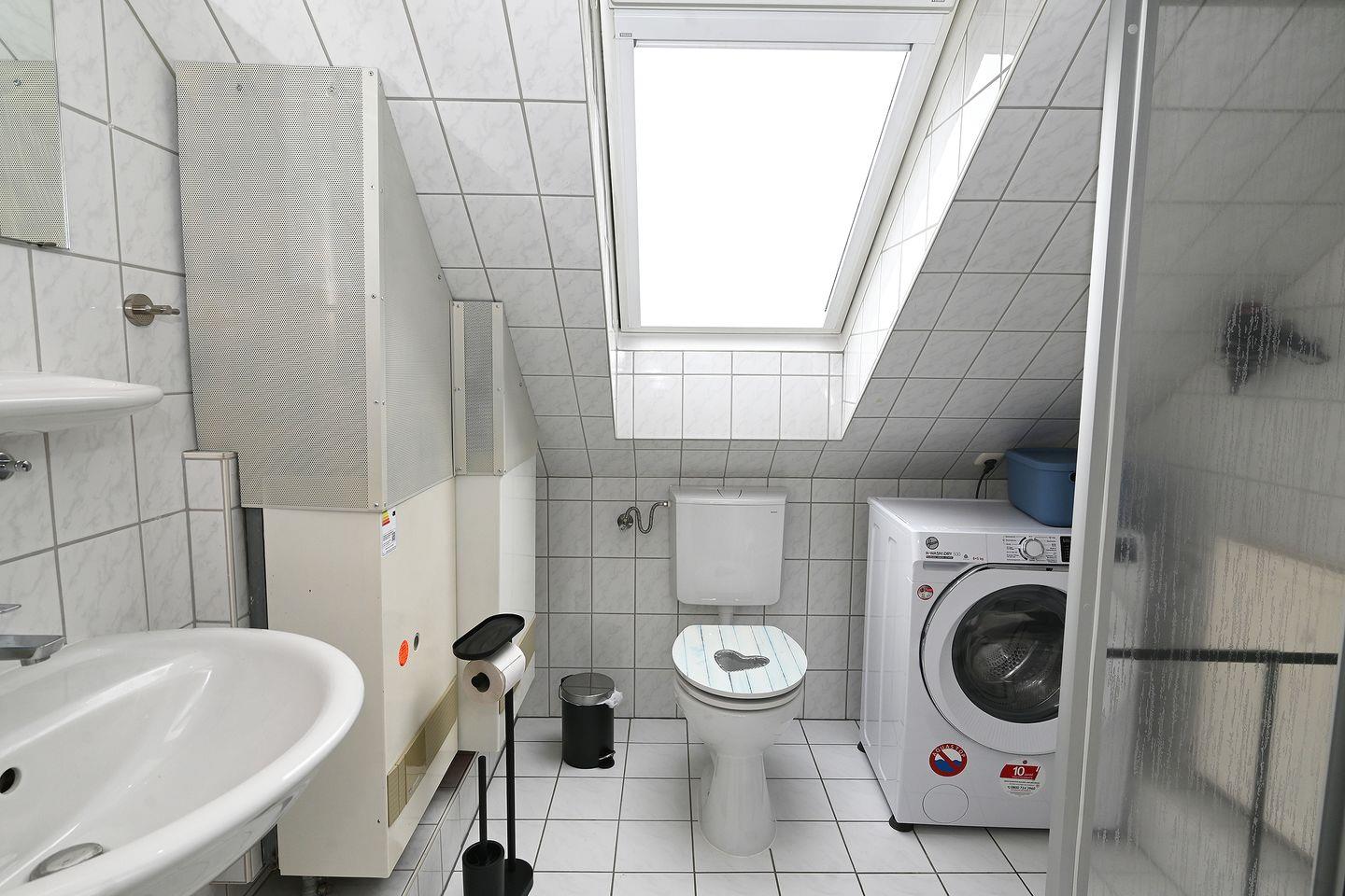Das Badezimmer verfügt über eine Dusche (bitte Dachschräge beachten), sowie einen Spiegel, Haartrockner und Waschtrockner. Ein Fenster sorgt für Tageslicht und optimale Belüftung.