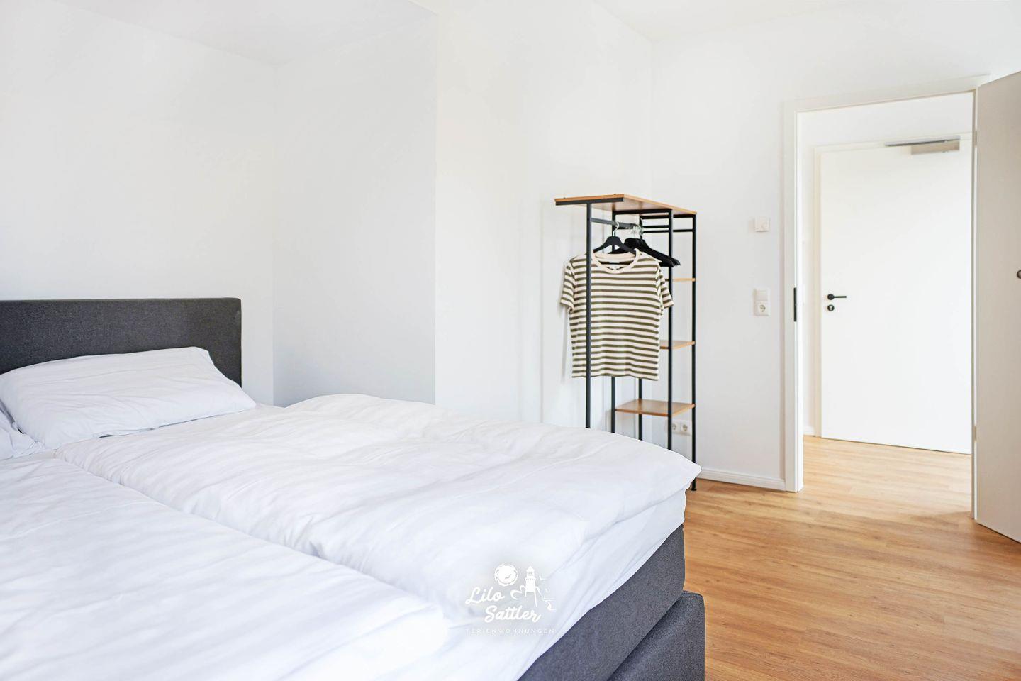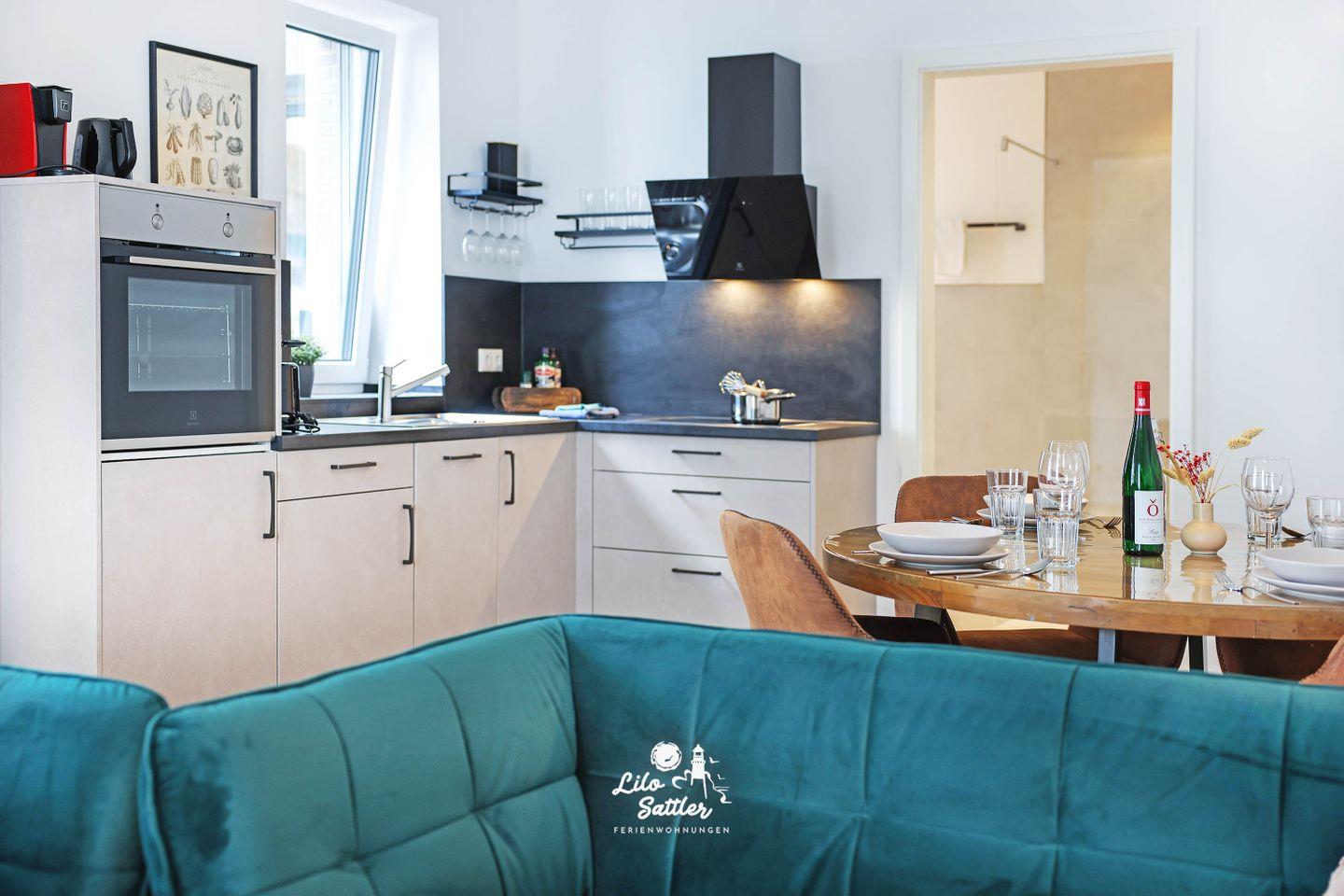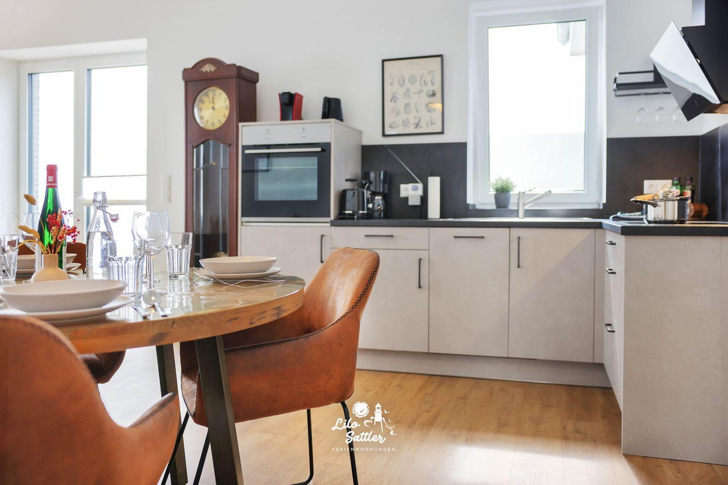 Zwei separate Schlafzimmer - jeweils mit Boxspringbetten - schaffen angenehme Rückzugsorte - ideal für Paare, Familie oder Freunde. Im Tageslichtbad sorgt eine bodengleiche Dusche für bequemen Komfort; zusätzlich steht ein separates Gäste-WC bereit. Ihr privates Wellness-Highlight ist die eigene Sauna – perfekt nach Wind und Wellen. Die voll ausgestattete Küche mit Ceran-Kochfeld, Backofen, Geschirrspüler, Kühlschrank mit Gefrierfach sowie Kaffeemaschine und Tassimo macht Selbstversorgung leicht, ob für das schnelle Frühstück oder den langen Kochabend.