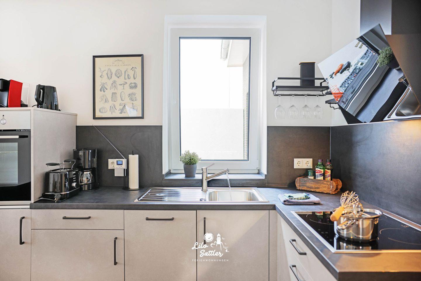 Offene Küchenzeile mit Kühlschrank mit Gefrierfach, Geschirrspüler, Ceranfeld, Backofen, Kaffeemaschine, Wasserkocher, Toaster, Eierkocher, Tassimo