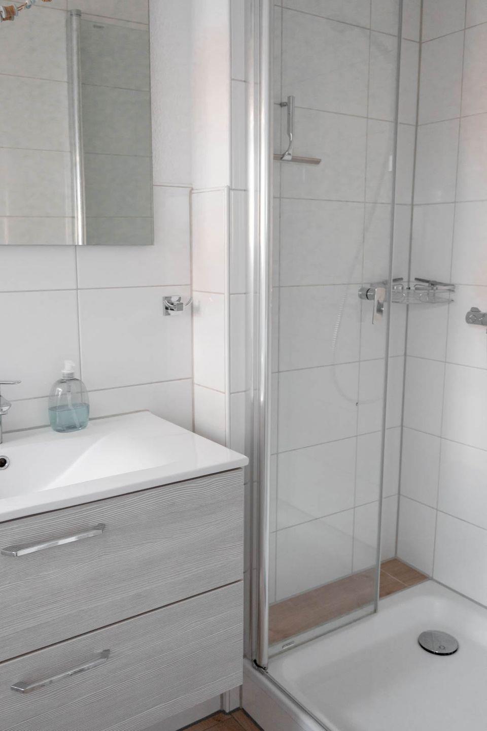 Die offene Küche ist zum Wohnzimmer hin ausgerichtet und verfügt über eine hochwertige Ceran-Kochfläche, einen Backofen, einen Kühlschrank sowie eine Spülmaschine. Ergänzt wird die Küchenausstattung durch eine Kaffeemaschine, einen Toaster, einen Wasserkocher sowie sämtliche notwendigen Küchenutensilien, Geschirr und Besteck. Ein Esstisch im Essbereich eignet sich ideal für gemeinsame Mahlzeiten.