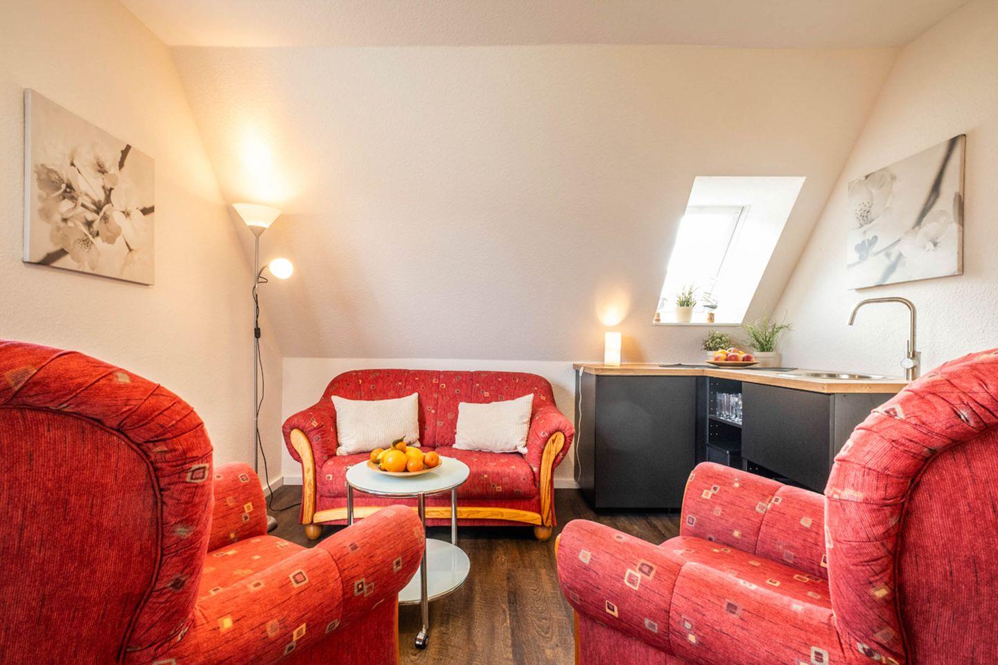 Im Wohnzimmer mit TV erwartet Sie eine gemütliche Sofaecke mit zusätzlichem Sessel. Der Essbereich mit Esstisch schafft einen angenehmen Rahmen für gemeinsame Mahlzeiten. Die offene, voll ausgestattete Küche ist zum Wohnzimmer hin ausgerichtet und verfügt unter anderem über einen Ceran-Herd, Kühlschrank mit Gefrierfach, Mikrowelle, Spülmaschine, Wasserkocher, Kaffeemaschine und Toaster. Hochwertige Küchenutensilien, Geschirr, Besteck und Geschirrhandtücher sind ebenfalls vorhanden, sodass Sie alle Annehmlichkeiten für die Selbstverpflegung genießen können.