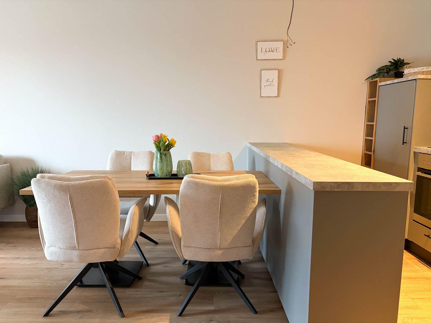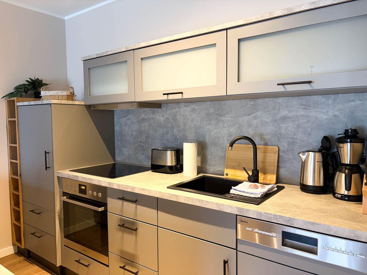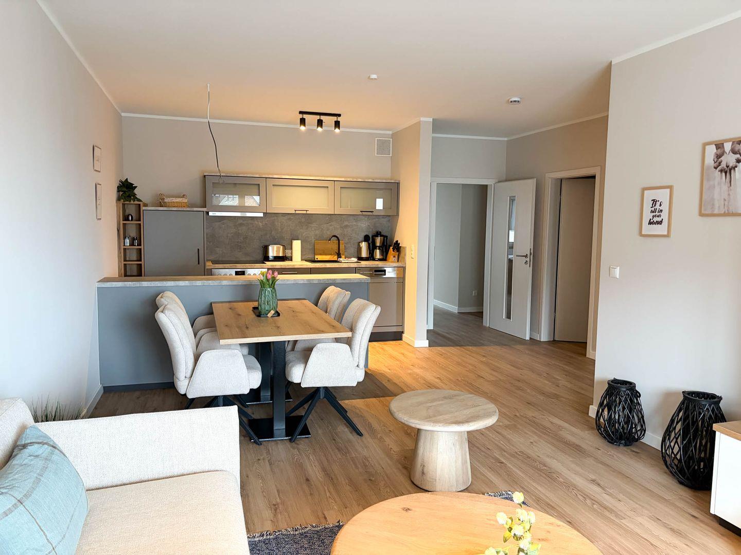 Die hochwertige Einrichtung spiegelt sich in jedem Detail wider: In der Wohnung finden Sie einen offenen Wohn- und Essbereich, eine stilvolle Sofaecke auf Vinylboden sowie ein einladenden Essbereich mit Esstisch, offen zur modernen Küche gestaltet. Diese ist vollständig ausgestattet mit Ceranherd, Backofen, Mikrowelle, Spülmaschine, Kühlschrank und Gefrierfach, Kaffeemaschine, Toaster, Wasserkocher sowie sämtlichen Küchenutensilien, Geschirr und Besteck. Die Wohnung verfügt über ein Tageslichtbad mit bodengleicher Dusche.