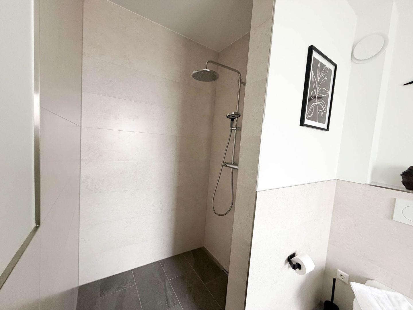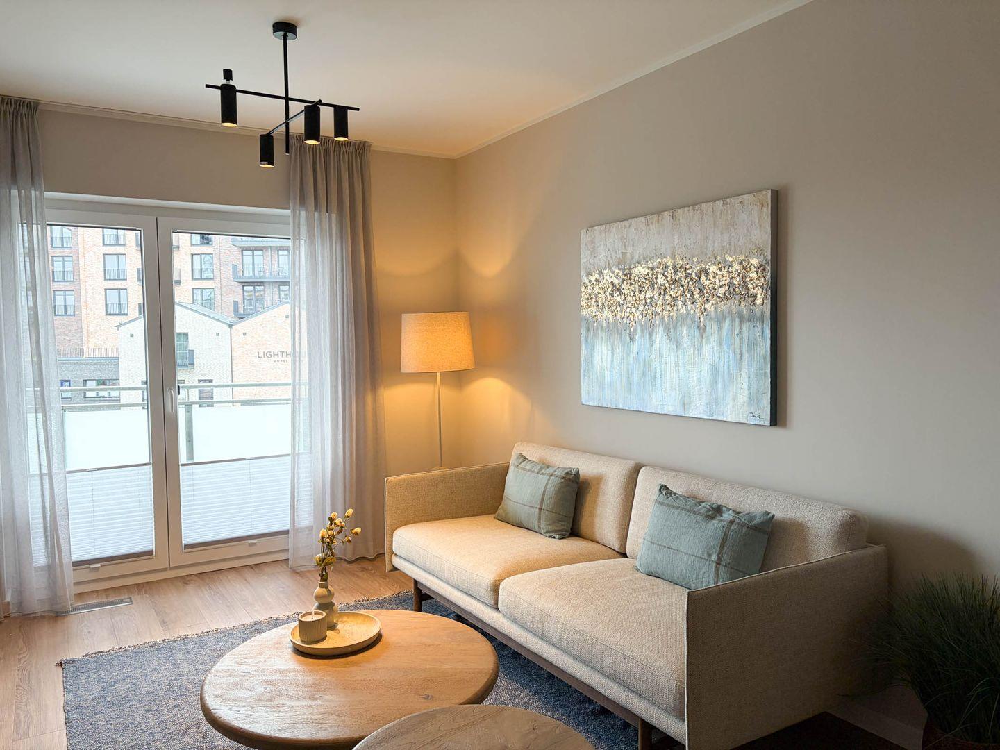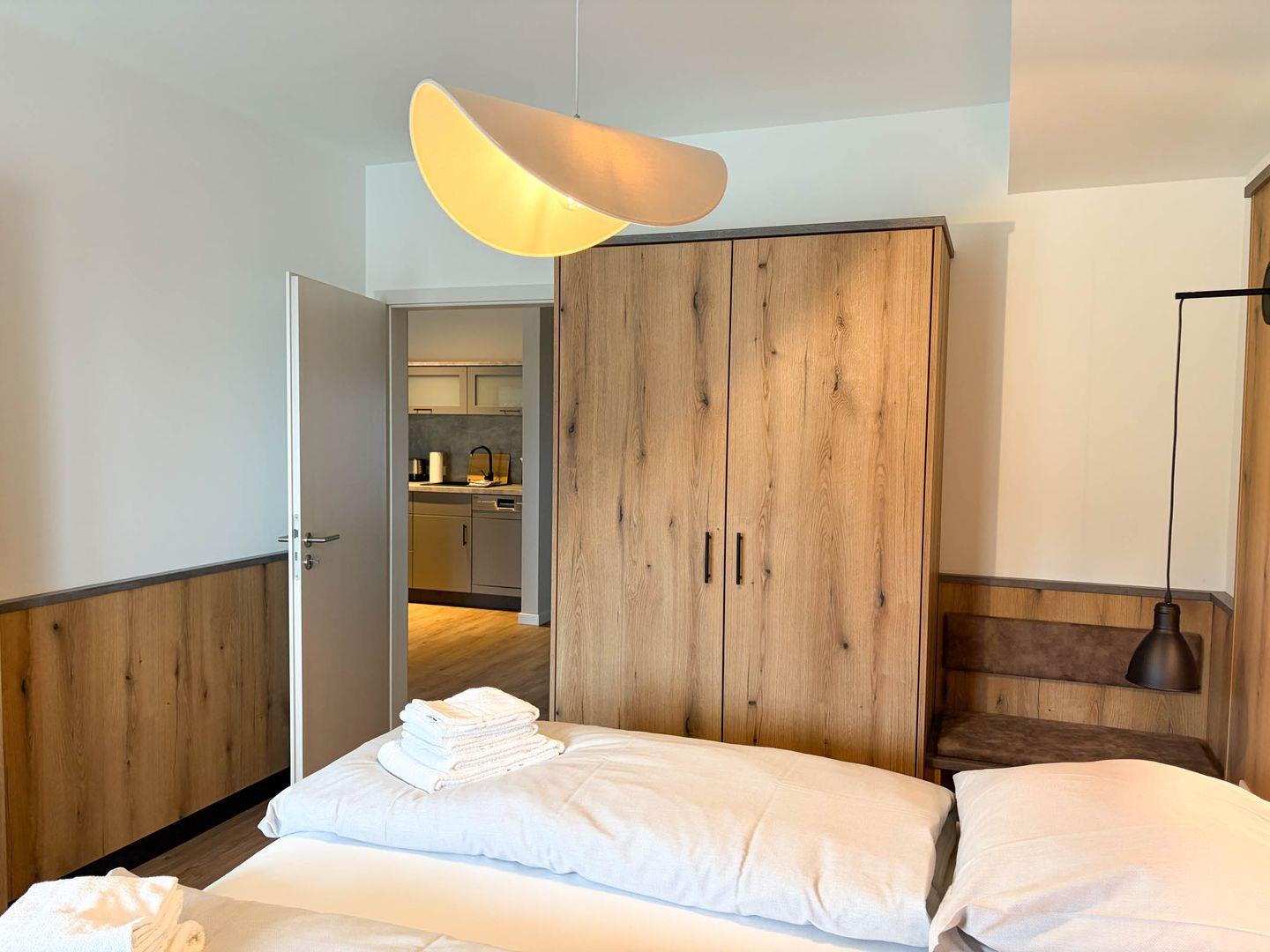 Die hochwertige Einrichtung spiegelt sich in jedem Detail wider: In der Wohnung finden Sie einen offenen Wohn- und Essbereich, eine stilvolle Sofaecke auf Vinylboden sowie ein einladenden Essbereich mit Esstisch, offen zur modernen Küche gestaltet. Diese ist vollständig ausgestattet mit Ceranherd, Backofen, Mikrowelle, Spülmaschine, Kühlschrank und Gefrierfach, Kaffeemaschine, Toaster, Wasserkocher sowie sämtlichen Küchenutensilien, Geschirr und Besteck. Die Wohnung verfügt über ein Tageslichtbad mit bodengleicher Dusche.