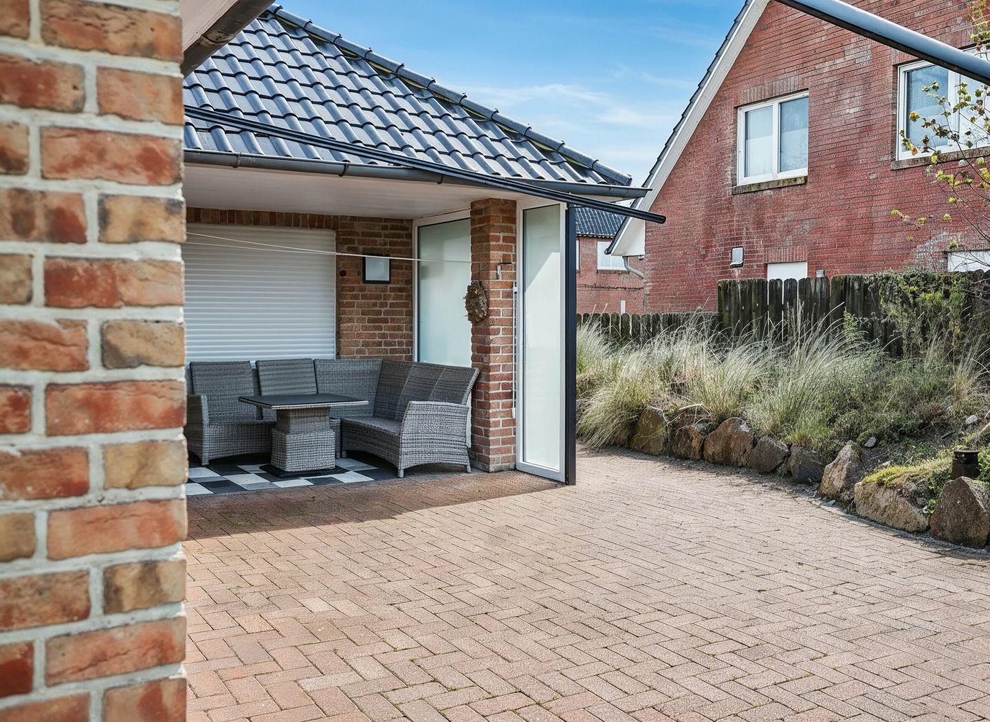Im Außenbereich lädt die große, überdachte Terrasse zum Verweilen ein. Hier können Sie bei jedem Wetter entspannen, und dank der elektrischen Markise genießen Sie sowohl sonnige als auch windige Tage in angenehmer Atmosphäre. Direkt vor dem Haus steht Ihnen ein Doppelcarport zur Verfügung, und hinter dem Carport befindet sich ein separater Fahrradabstellraum mit Steckdosen – ideal, um E-Bikes bequem zu laden.