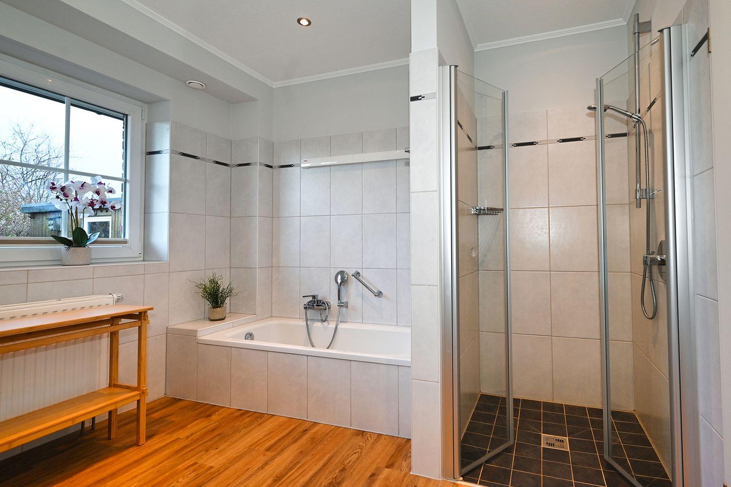 Das moderne Badezimmer ist mit einer ebenerdigen Dusche und einer Badewanne ausgestattet, mit Fenster, und bietet so ein helles und freundliches Ambiente. Zusätzlich verfügt das Haus über ein Gäste-WC, ebenfalls mit Fenster.