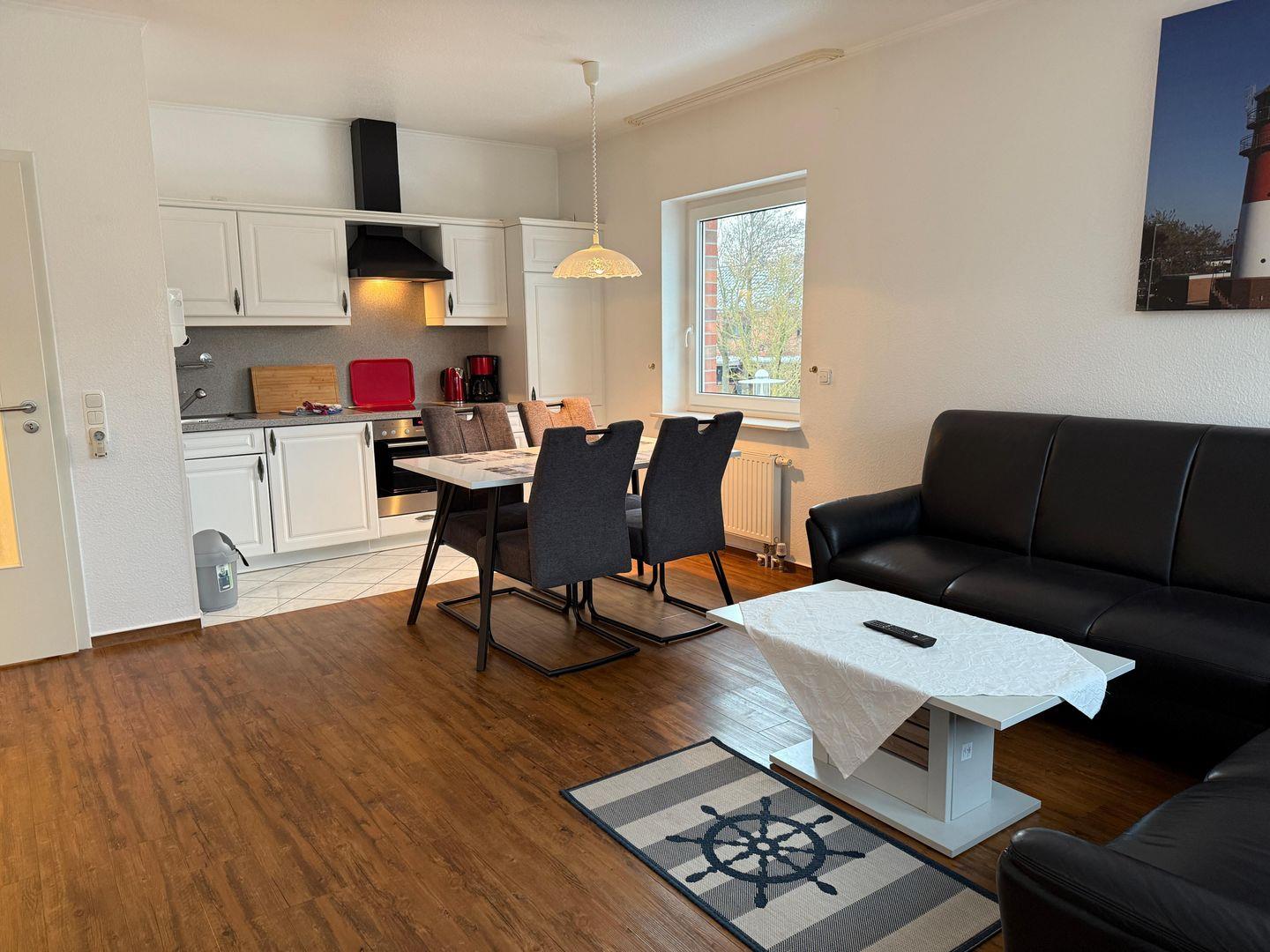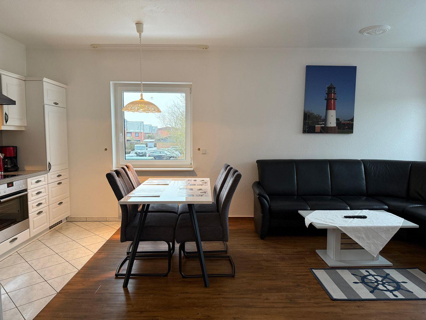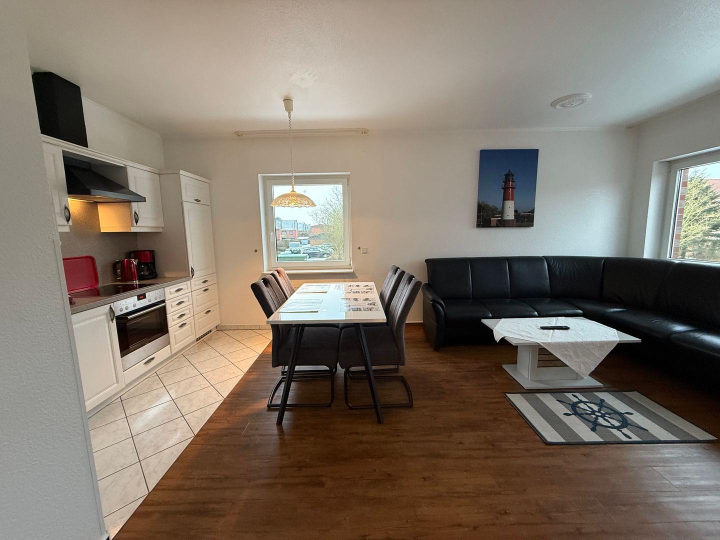 In der Küche gibt es eine gemütlich Sitzecke. Geschirrspüler und Backofen sind ebenfalls vorhanden.