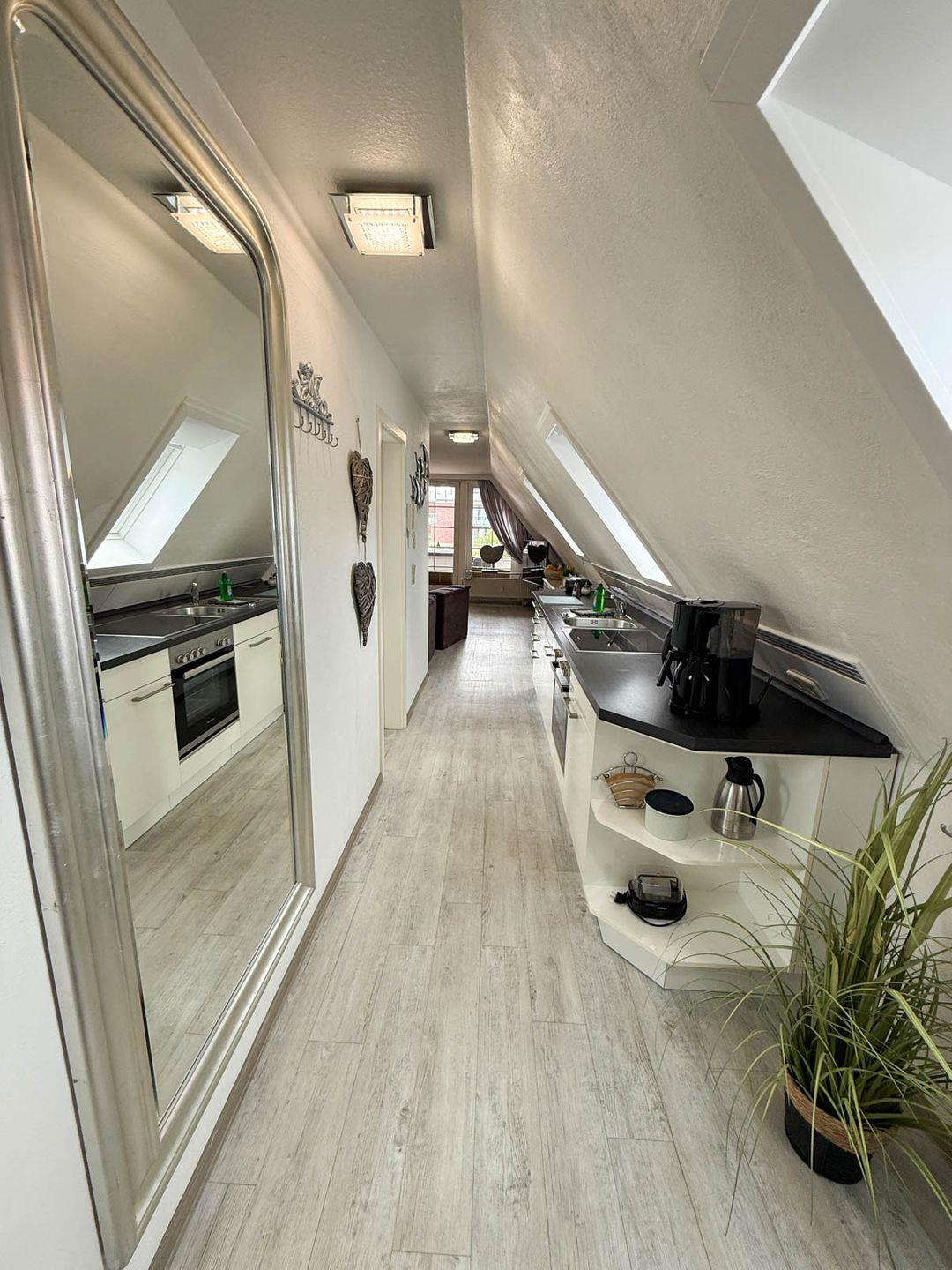Der offene Wohn- und Essbereich lädt mit gemütlicher Sofaecke sowie einem Esstisch zum Verweilen ein. Die moderne, offene Küche ist mit Ceranherd, Backofen, Kühlschrank, Spülmaschine, Wasserkocher, Kaffeemaschine, Toaster und sämtlichen Küchenutensilien umfassend ausgestattet, sodass eine komfortable Selbstverpflegung problemlos möglich ist.