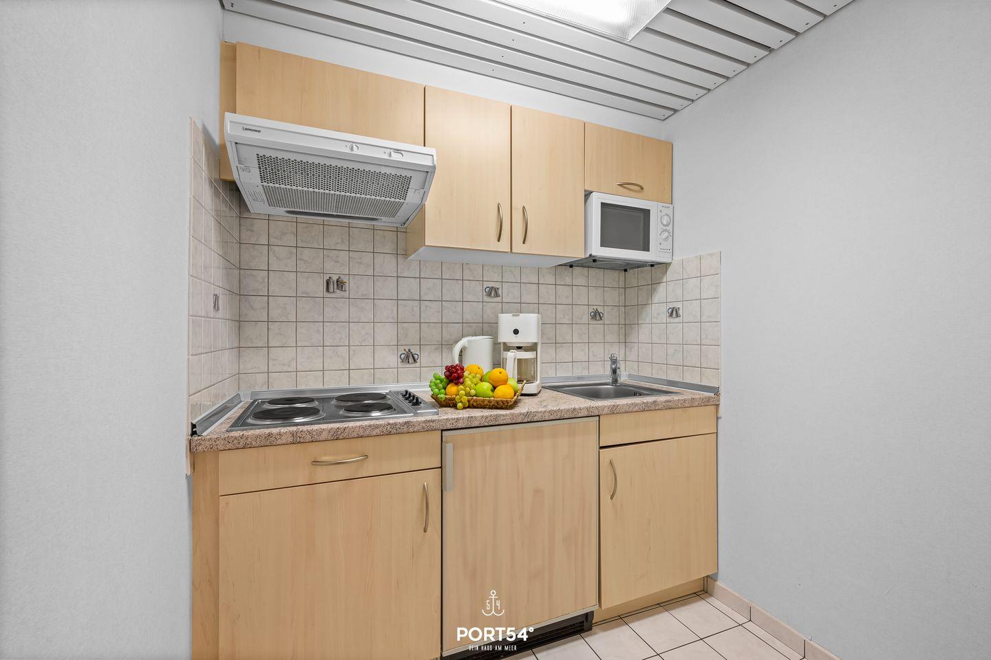 Die separate Küche ist vollständig ausgestattet Geschirr, Besteck und Küchenutensilien. Erstausstattung und Geschirrhandtücher sind ebenfalls vorhanden. Bad und Küche werden frisch saniert und stehen ab April 2026 in modernem Design zur Verfügung. Die Fotos werden nach Abschluss der Arbeiten aktualisiert.