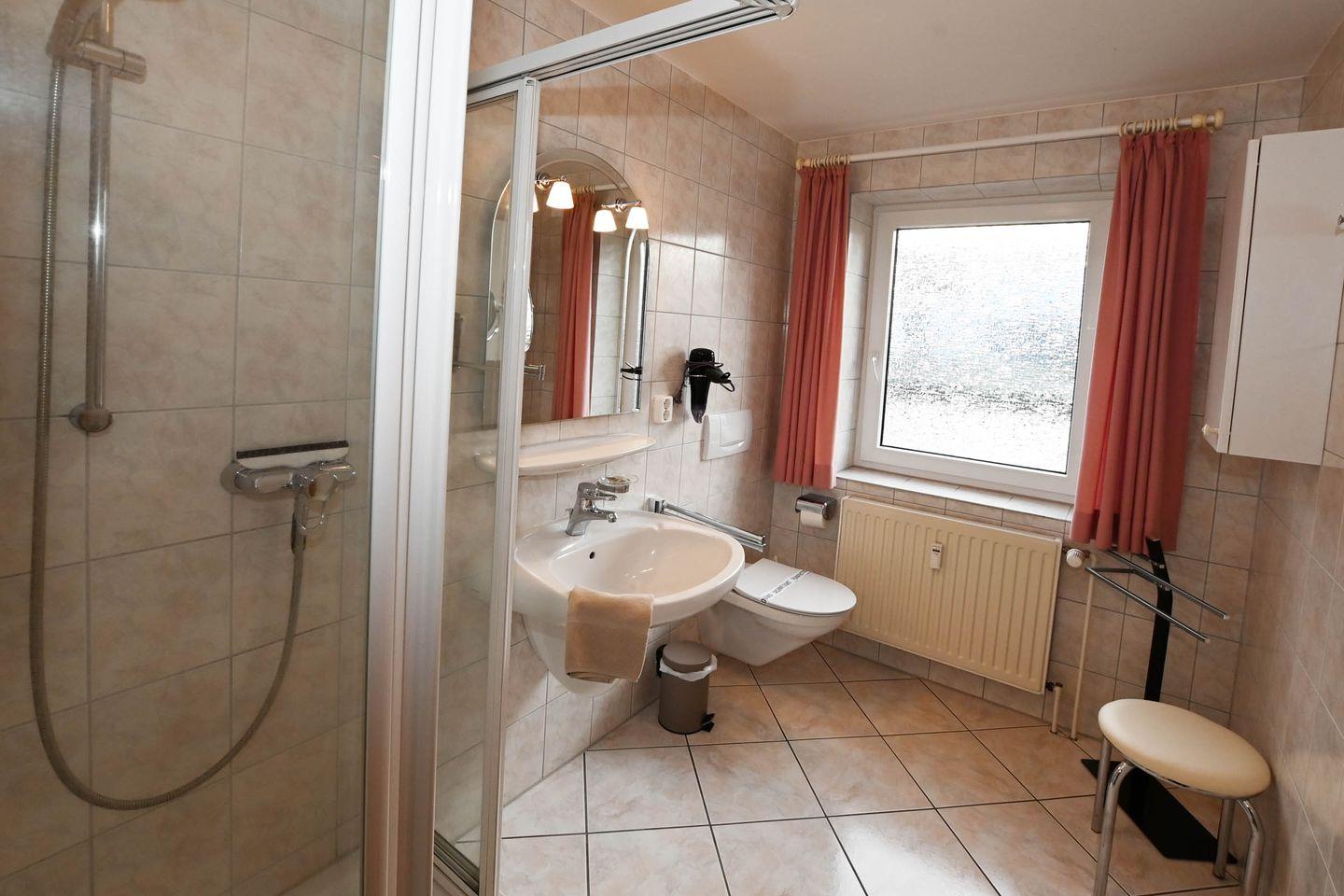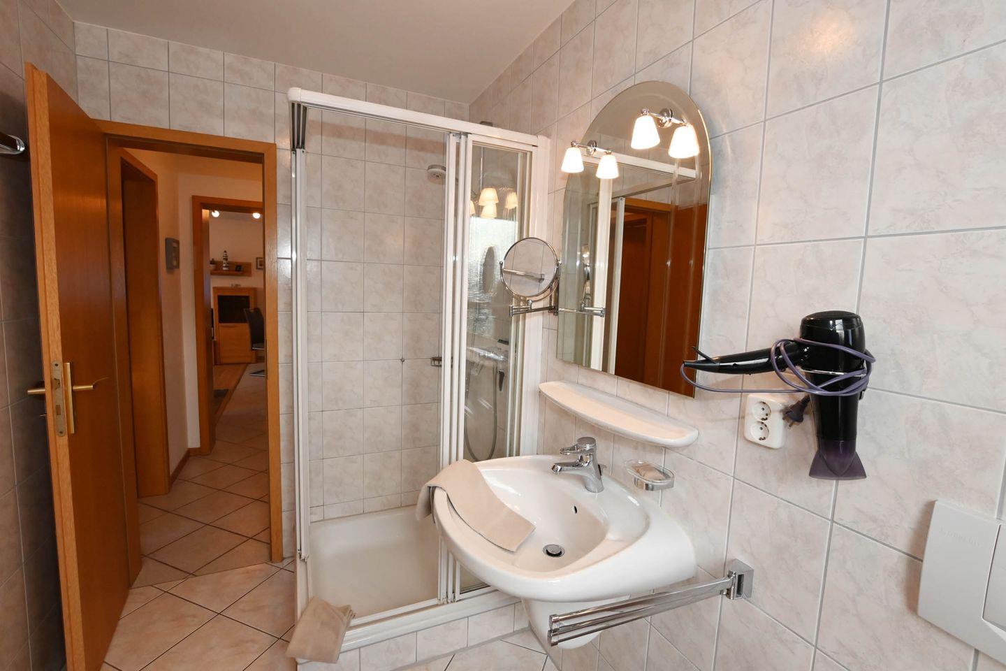 Das Badezimmer ist mit einer Dusche, WC, Waschbecken, Spiegel, Kosmetikspiegel und einem Haartrockner ausgestattet. Die Nutzung einer gemeinschaftlichen Waschmaschine ermöglicht Ihnen zusätzliche Flexibilität während Ihres Aufenthalts.