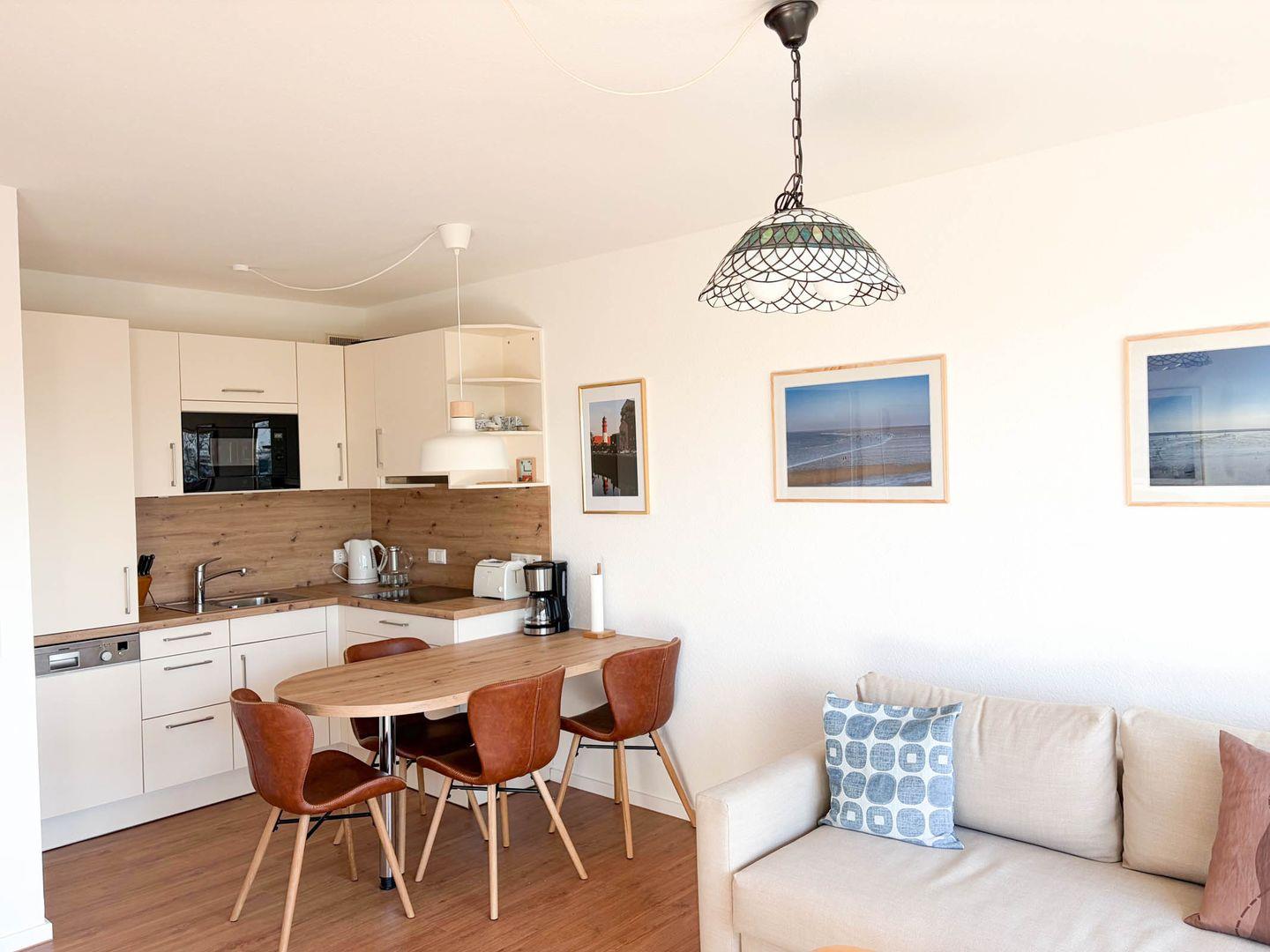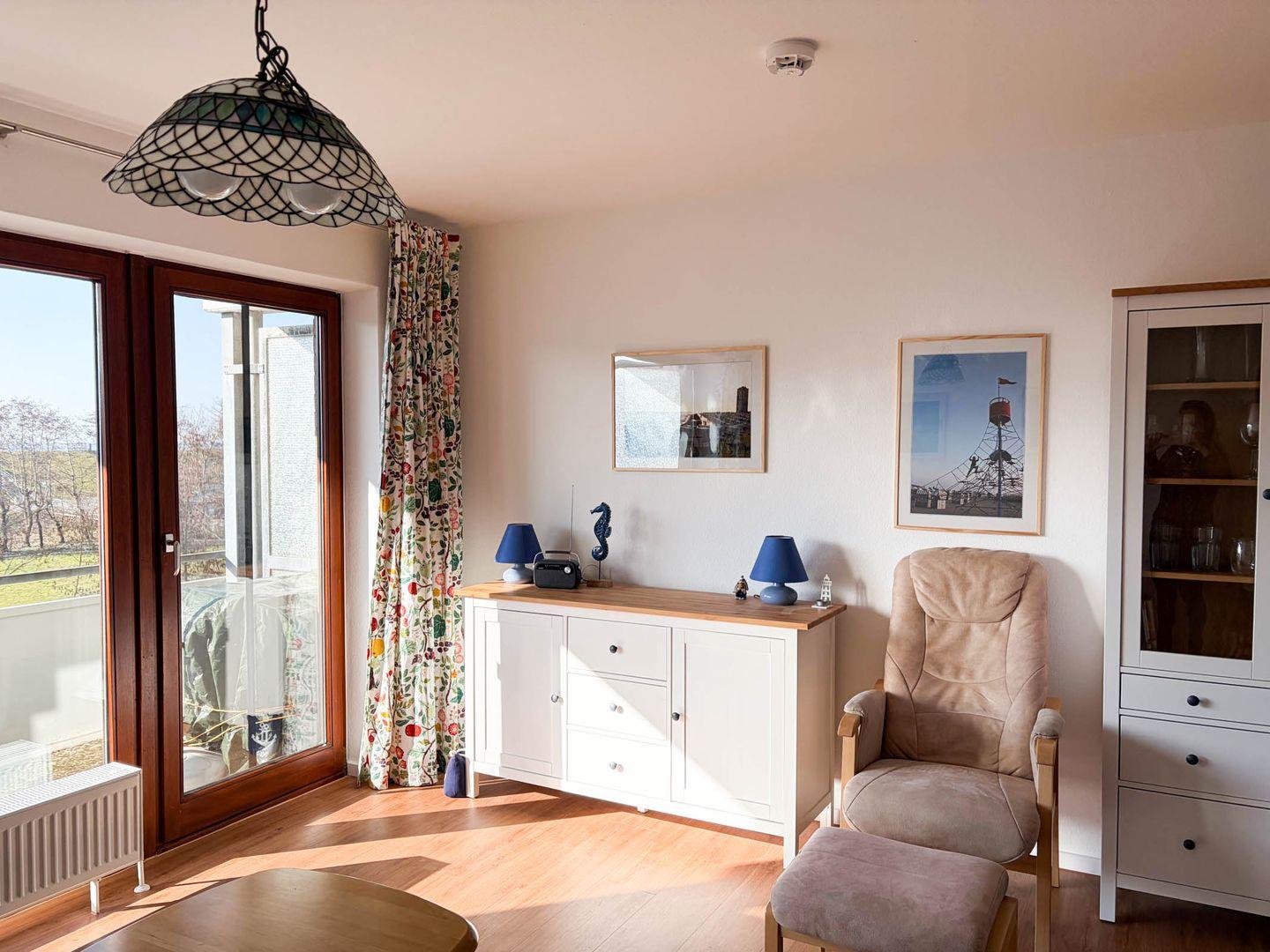 Die Ferienwohnung Nr. 23 im Haus Nordseeblick befindet sich im zweiten Obergeschoss und verfügt über einen Balkon. Im Wohnzimmer finden Sie eine Couchgarnitur mit einem Sessel vor. Die Küche und der Essbereich sind im Wohnbereich integriert. Das Schlafzimmer ist mit einem Doppelbett und einem Fernseher ausgestattet. Das Bad verfügt über eine Dusche/WC. Vom Wohnraum aus gelangt man auf den in Südwestlage liegenden Balkon. Im Keller befinden sich eine Waschmaschine und Trockner (gebührenpflichtig) sowie ein Abstellraum für Fahrräder. Fährräder können auch vor dem Haus im Fahrradständer abgestellt werden. Das Haus verfügt über einen Aufzug.