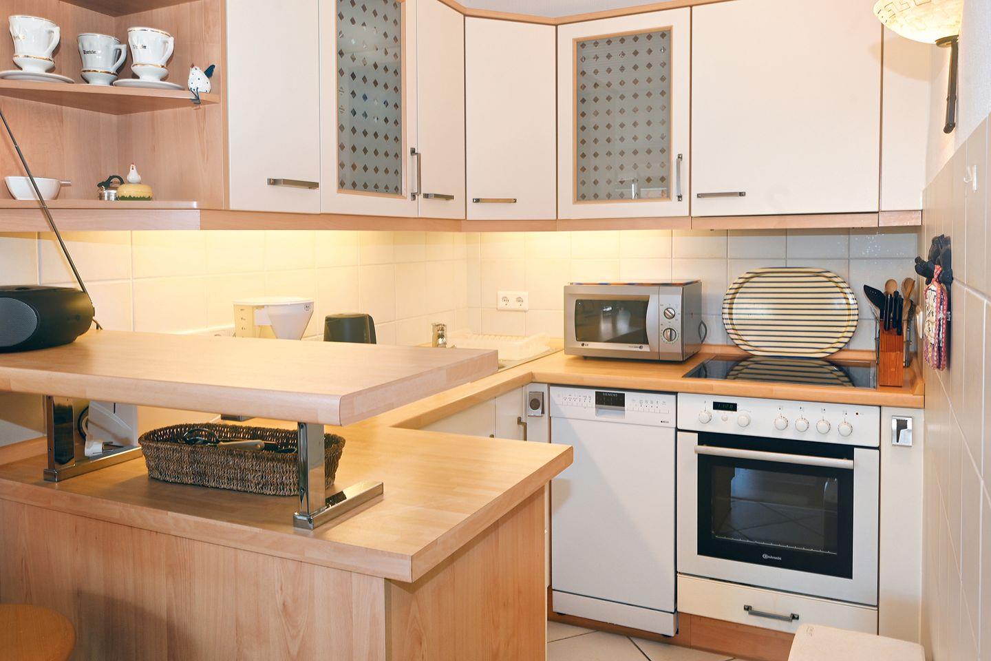 Die Küche ist offen zum Wohnzimmer angelegt und gut ausgestattet: Spülmaschine, Backofen, Mikrowelle, Kühlschrank, Kaffeemaschine, Wasserkocher, Toaster sowie Küchenutensilien, Geschirr und Besteck stehen Ihnen zur Verfügung.