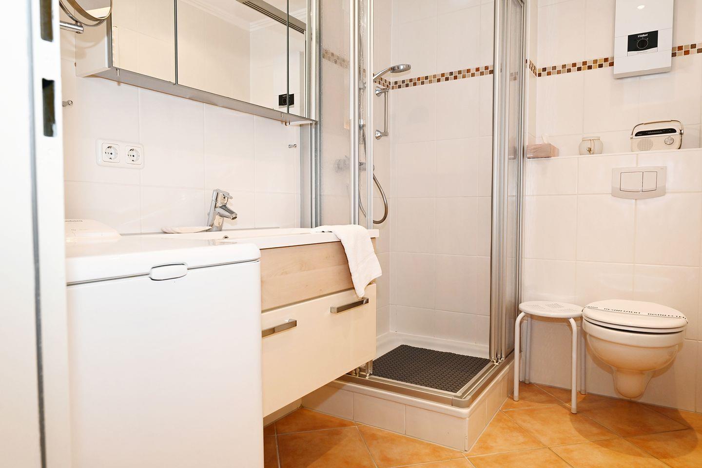 Das hell gestaltete Badezimmer verfügt über eine Dusche, sowie eine Handtuchheizung.