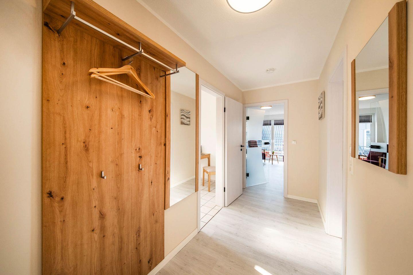 Eine Garderobe sowie Stauraum durch Kommode unterstützen dabei, das Gepäck ordentlich zu verstauen. Sichtschutz an allen Fenstern sorgt für Privatsphäre.