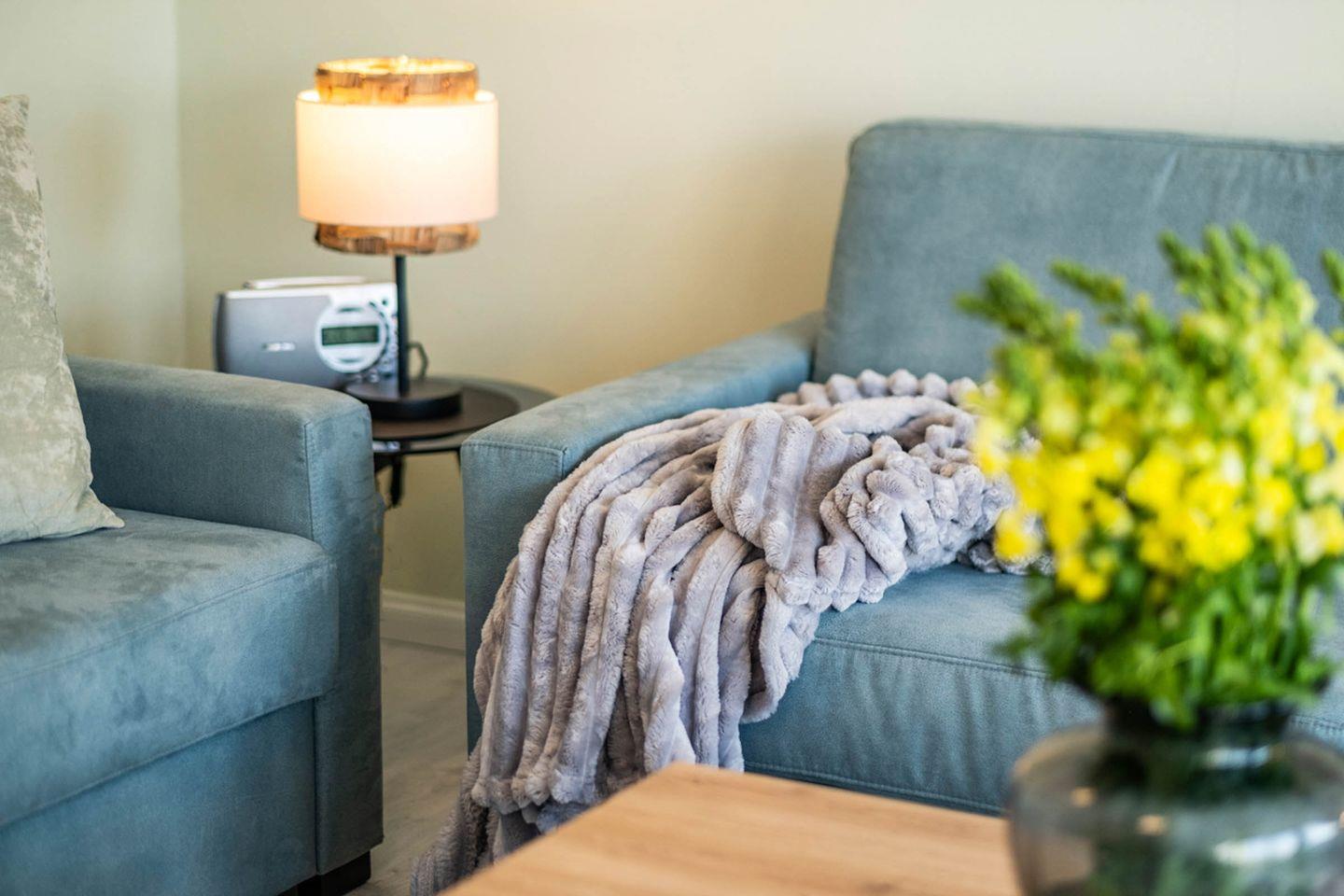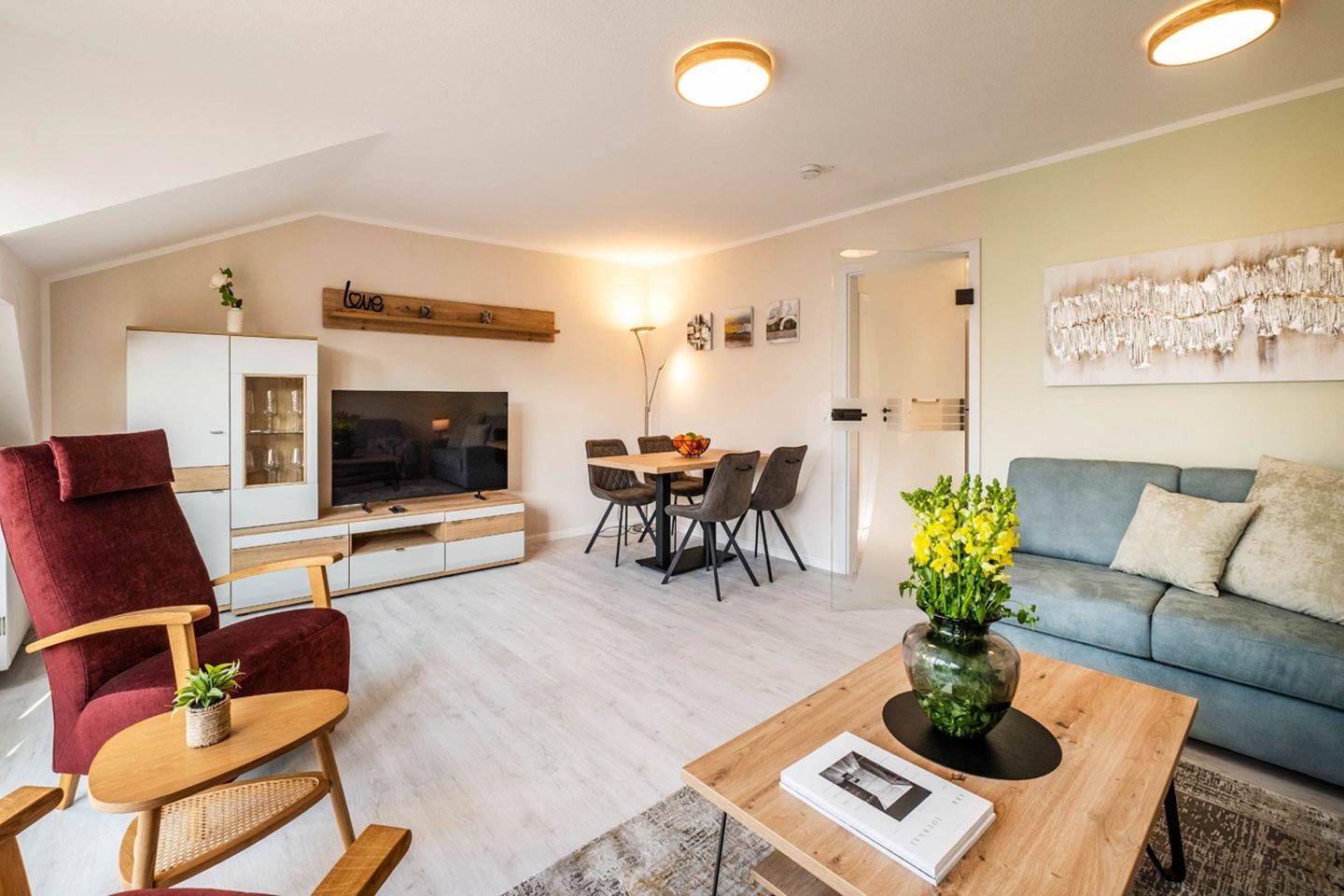 Im Wohnbereich erwarten Sie eine Sofaecke (mit Schlaffunktion) und Sessel sowie ein TV – passend für entspannte Abende nach einem Tag am Wasser. Zudem kann das Sofa zu einem gemütlichen Schlafsofa umgestaltet werden, sodass hier auch für mehr als 2 Personen oder für getrennt Schlafende ausreichend Platz findet.