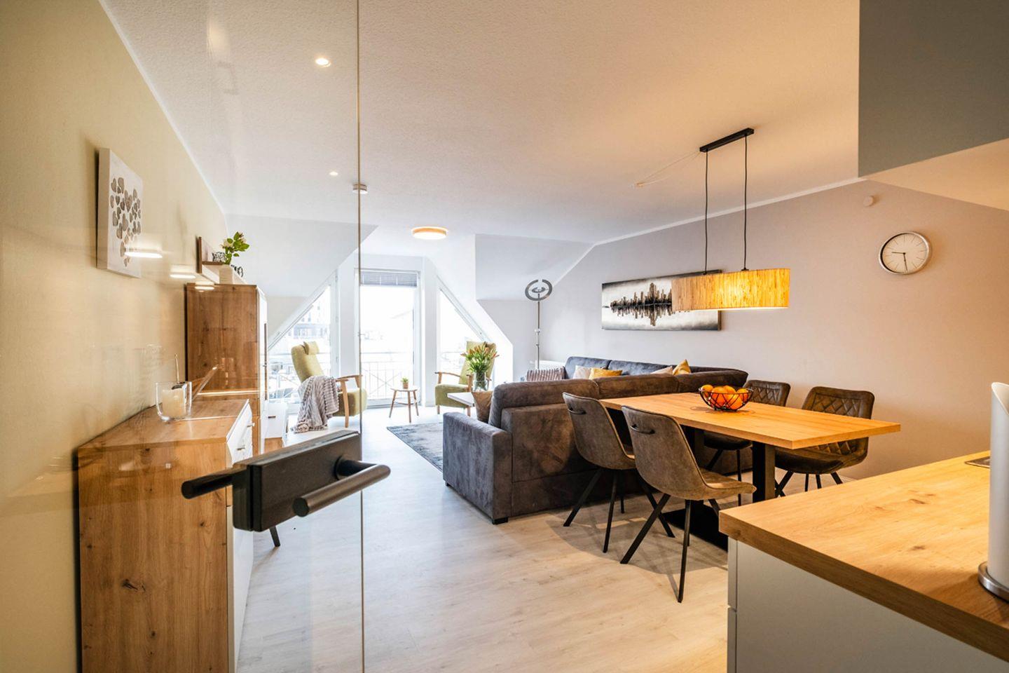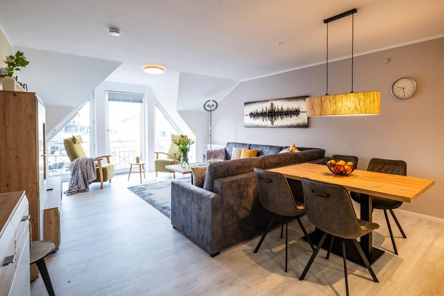 Das absolute Highlight dieser Wohnung ist der Logenplatz direkt am Fenster: Genießen Sie einen fantastischen Panoramablick auf die belebte Büsumer Fußgängerzone. Beobachten Sie das bunte Treiben bei einer Tasse Kaffee ganz entspannt aus der ersten Reihe. Da die Wohnung über keinen Balkon verfügt, holen wir Ihnen das pulsierende Leben durch die großen Fensterfronten direkt ins gemütliche Wohnzimmer.