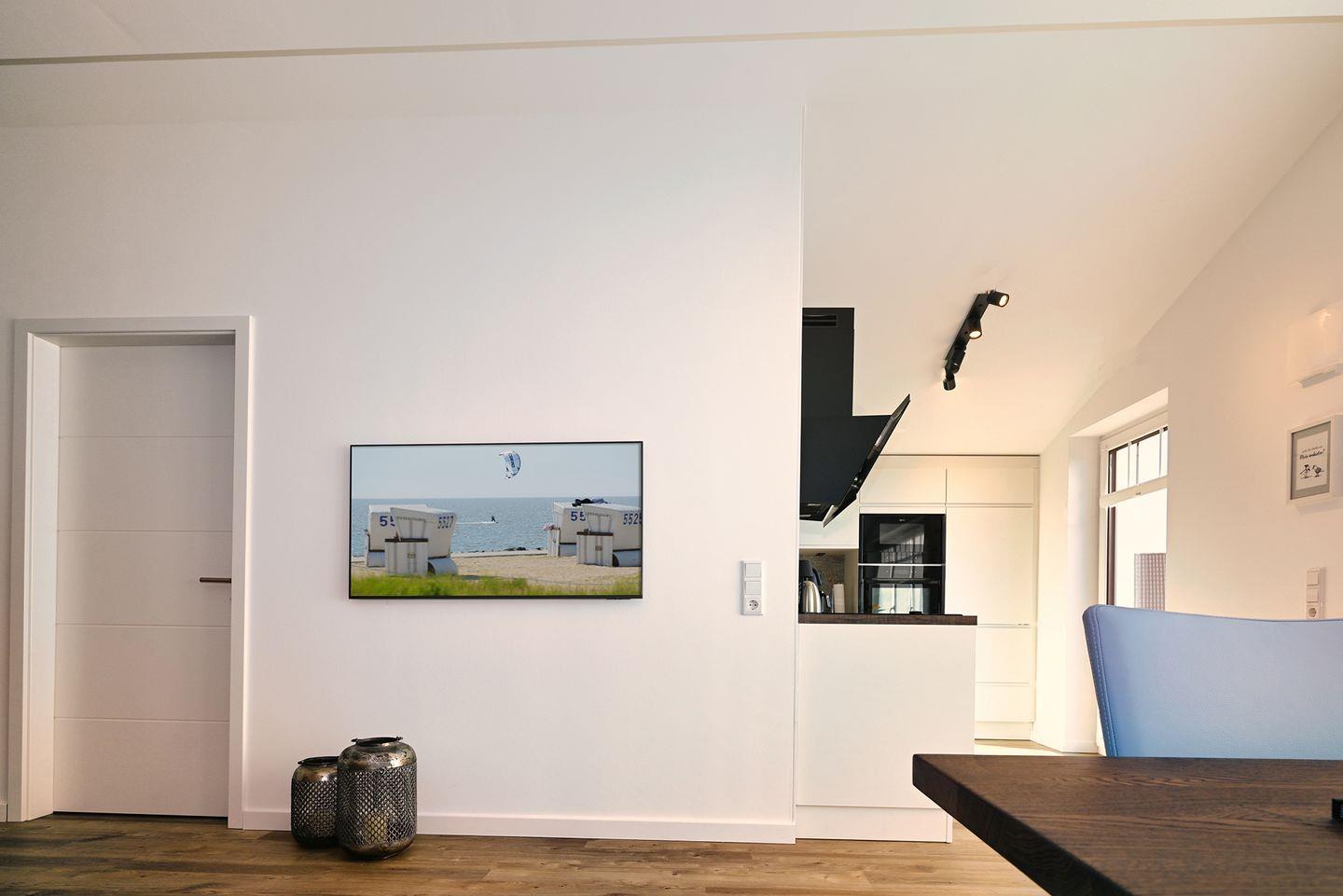 Die offene Küche mit mediteranem Flair ist zum Wohnbereich integriert und sorgt für gemeinsame Mahlzeiten. Ausgestattet ist sie unter anderem mit Induktionsherd, Backofen, Mikrowelle, Kühlschrank mit Gefrierfach, Spülmaschine, Kaffeemaschine, Wasserkocher, Toaster sowie Küchenutensilien, Geschirr und Besteck.