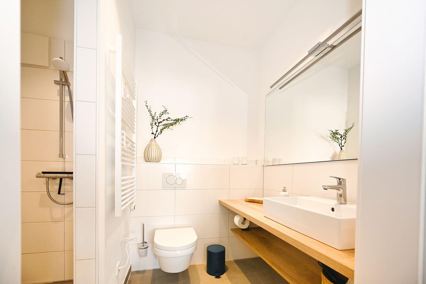 Zwei Badezimmer mit insgesamt zwei bodengleichen Duschen bieten Komfort. Eines der Bäder befindet sich en Suite.