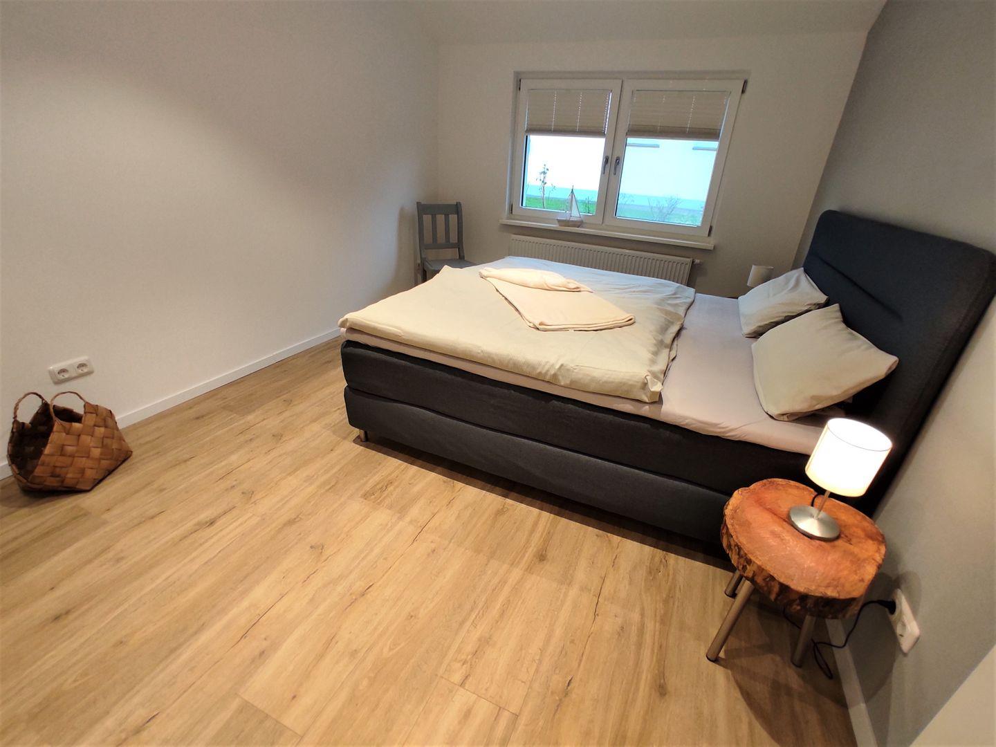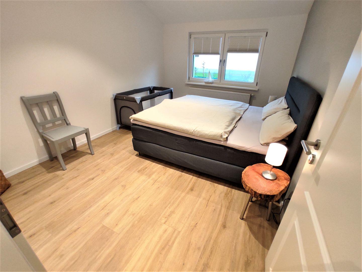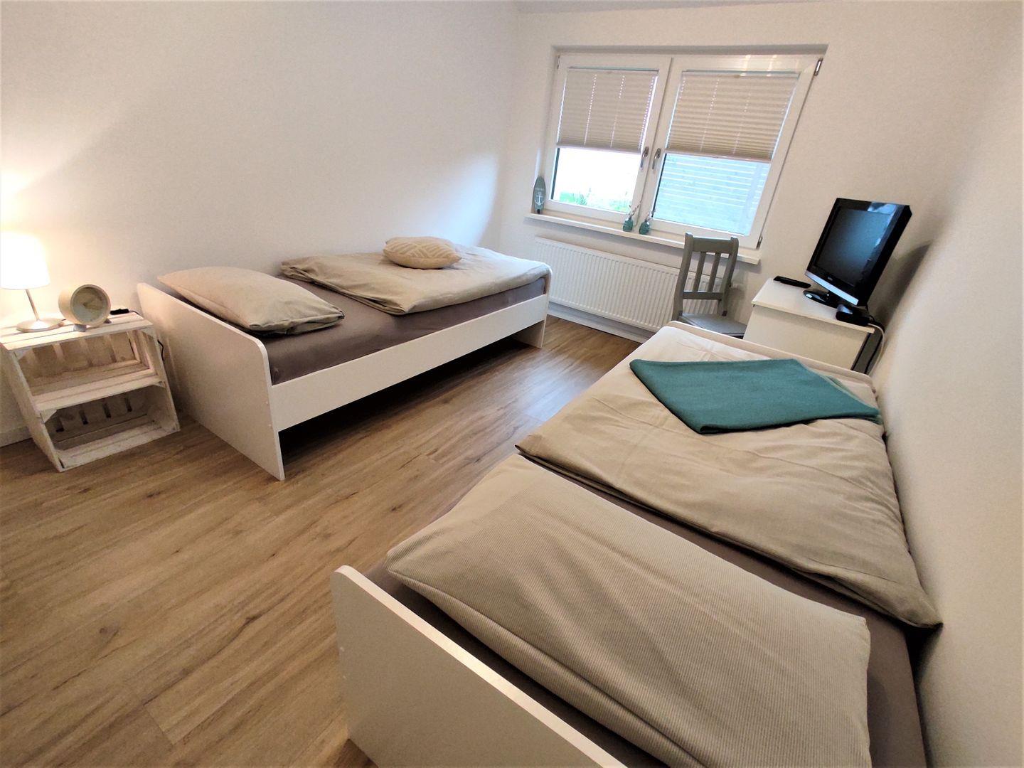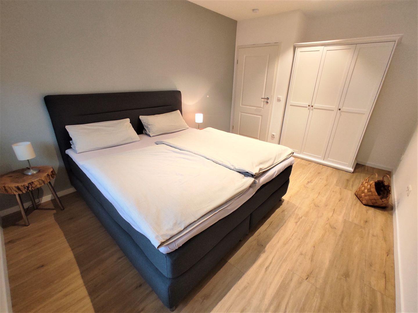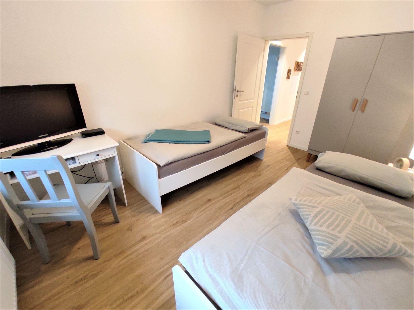 Das Hauptschlafzimmer ist mit einem Boxspring- Doppelbett (1,80x 2m, durchgehende Matratze mit Topper) und einem Kleiderschrank eingerichtet. Das 2te Schlafzimmer verfügt über 2 Einzelbetten, ein TV- Gerät und ebenfalls über einen Kleiderschrank für Ihre Urlaubsgarderobe.