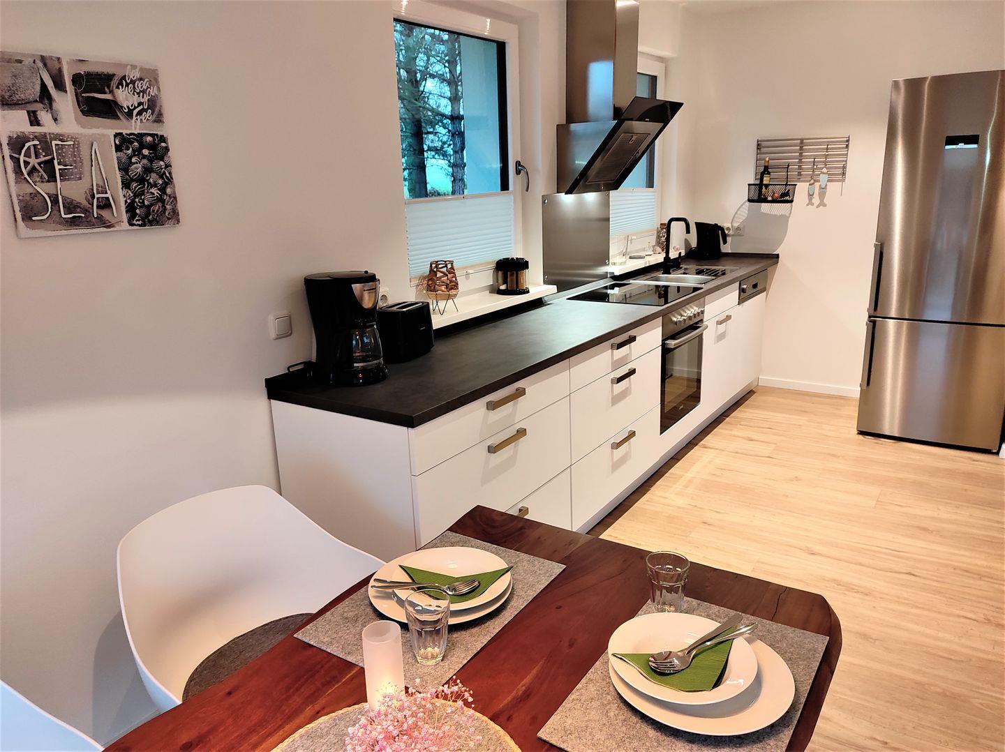 Die moderne Küchenzeile im Wohnraum ist mit einem Geschirrspüler, einem großen Kühlschrank mit 2 Gefrierschubladen, einem Herd mit Backofen, Mikrowelle und allem Nötigen komplett eingerichtet und passt sich perfekt an den Raum an.