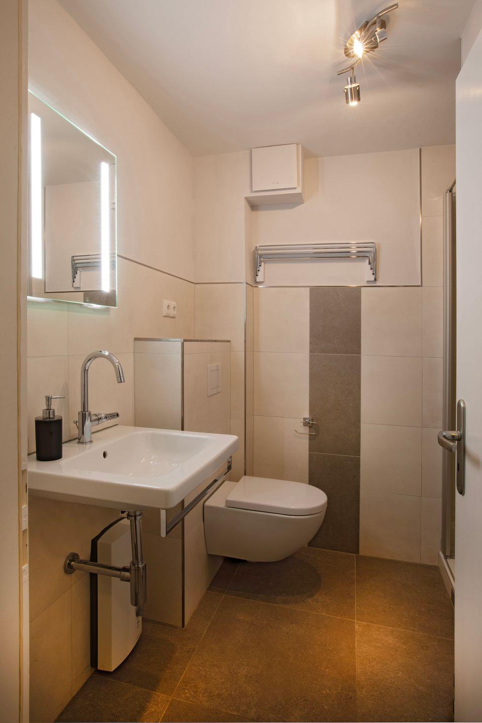 Das Schlafzimmer bietet ein ruhiges Ambiente mit einem komfortablen Bett, das für erholsame Nächte sorgt. Das bodengleiche Duschbad ist modern und funktionell ausgestattet mit Haartrockner, Waschbecken und einem WC. Zudem erwartet Sie eine qualitativ hochwertige Ausstattung mit Waschbecken, Spiegel und warmem Wasser, um Ihren Aufenthalt so angenehm wie möglich zu gestalten.