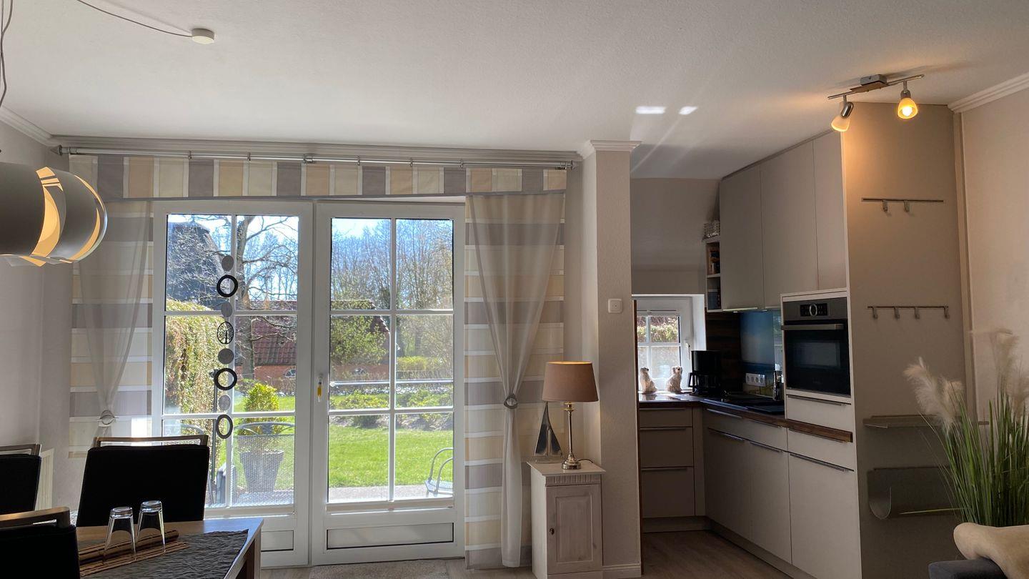 Die Wohnung ist mit einem einladenden Wohnzimmer ausgestattet, das mit modernen Laminatboden und einer gemütlichen Sofaecke zum Entspannen einlädt. Die offene Küche ist 2025 neu eingebaut und bestens ausgestattet und verfügt über hochwertige Geräte wie einen Cerankochfeld, Kühlschrank mit Gefrierfach, Geschirrspüler, Kaffeemaschine, Toaster und viele Küchenutensilien. Hier können Sie leckere Mahlzeiten zubereiten und diese am Esstisch im Wohnzimmer genießen.