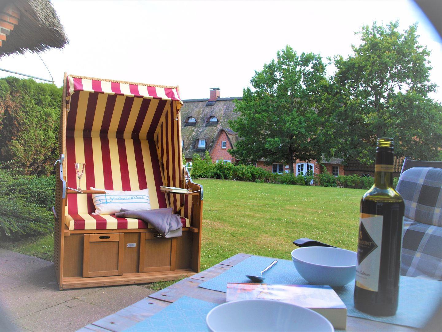 Wenn die Sonne scheint, laden die überdachte Terrasse und die Gartenmöbel dazu ein, die frische Nordseeluft zu genießen. Machen Sie es sich im Strandkorb gemütlich und erleben Sie unvergessliche Momente im Freien. Genießen Sie den Blick auf die umliegende Landschaft von der Terrasse aus, wo Sie den Alltag hinter sich lassen können.