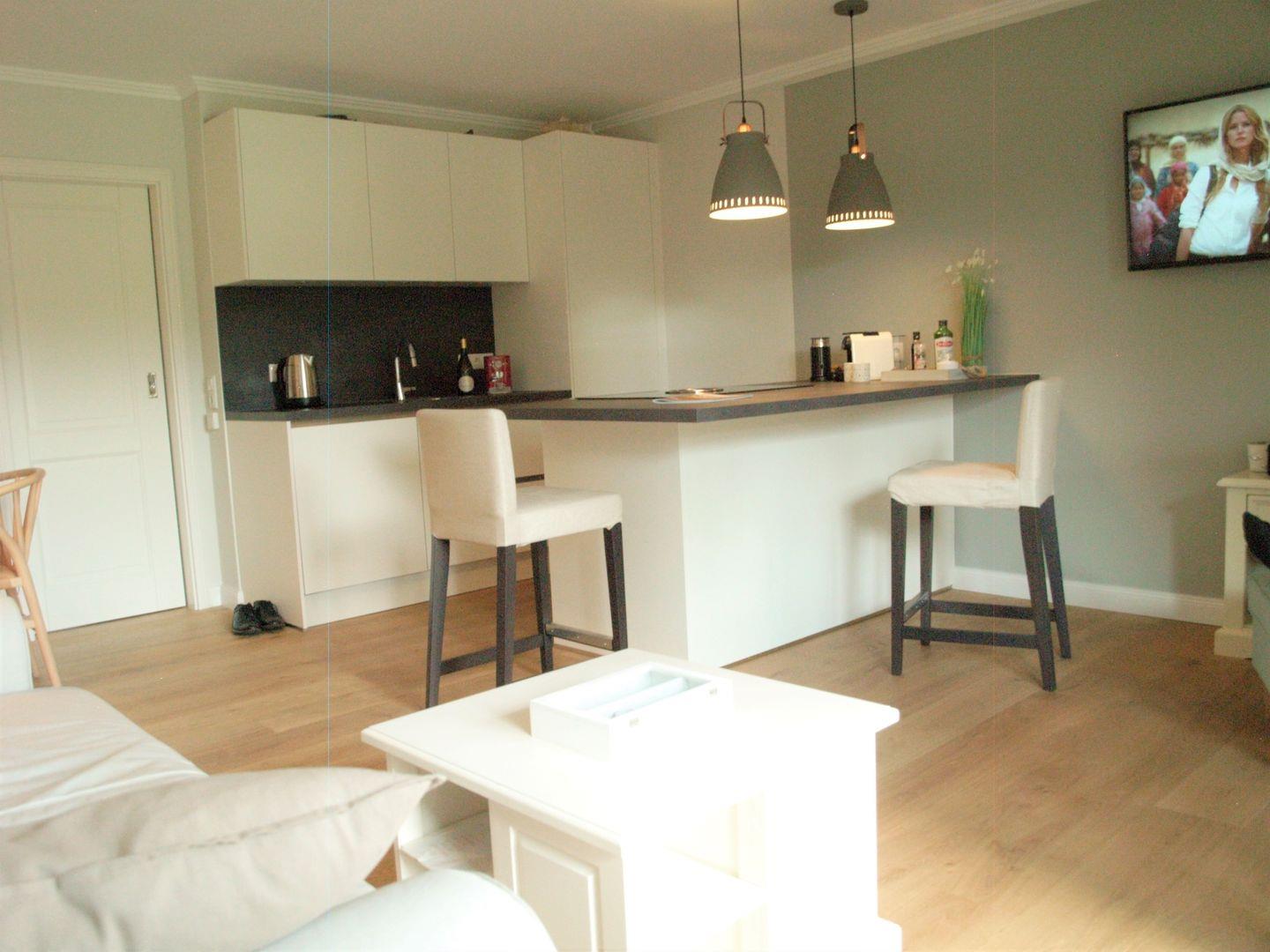 Der lichtdurchflutete Wohnbereich ist modern und gemütlich eingerichtet und lädt zum Entspannen ein. Genießen Sie Ihre Lieblingssendungen auf dem TV (Glasfaser) oder lauschen Sie Ihrer Wunschmusik über die HiFi-Anlage. Die offene Küche ist mit hochwertigen Geräten ausgestattet, darunter ein Induktionsherd mit Bora-Abzug, ein Elektrobackofen und eine Spülmaschine. Sie finden hier alles, was Sie brauchen, um kulinarische Köstlichkeiten zu zaubern: vom Kühlschrank mit Gefrierfach bis zur Kaffeemaschine – nichts steht Ihrem Kochvergnügen im Wege.