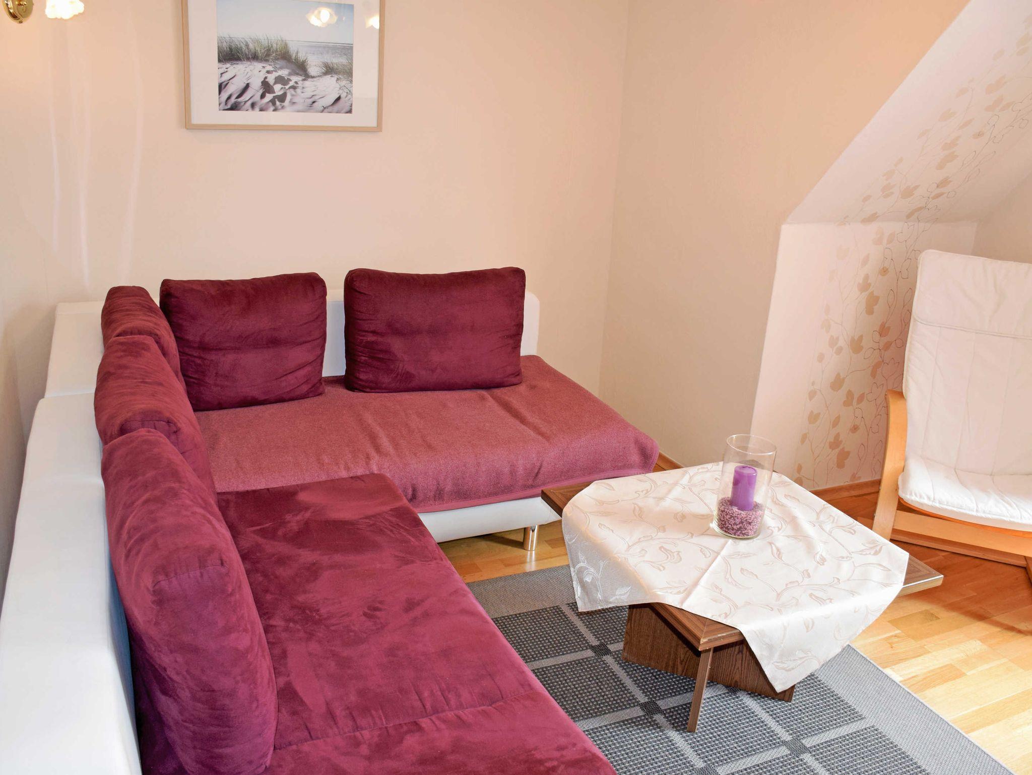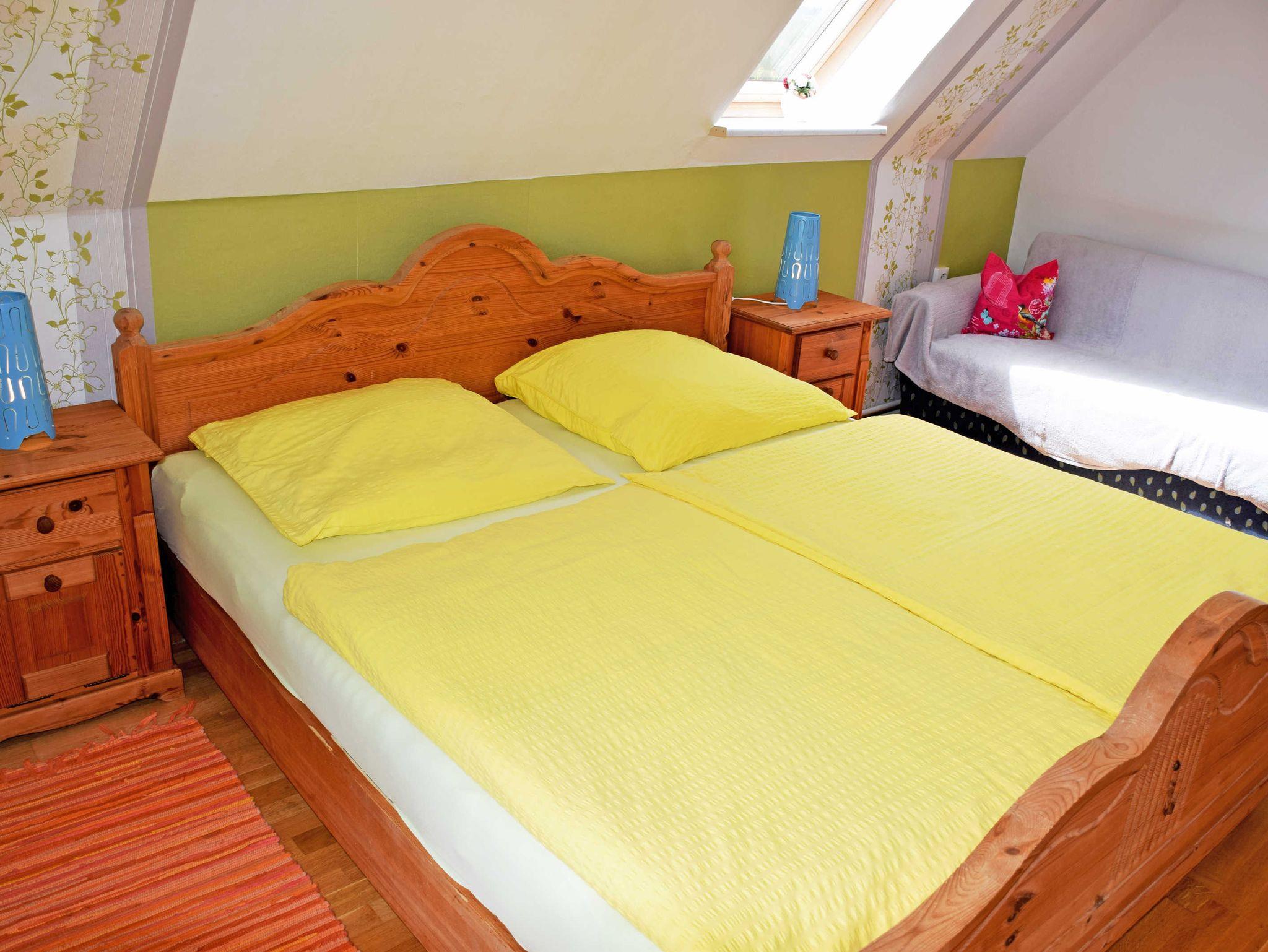 Über einen separaten Eingang und eine Treppe gelangt man im Obergeschoss in den Wohnflur. Im Schlafzimmer befinden sich ein bequemes Doppelbett mit einem Nachttisch und Leselampen und ein Kleiderschrank. Im Wohnzimmer befindet sich eine Sitzcouch mit Tisch, Sessel und ein Flachbild-TV-Gerät. Hier kann auf der Couch bei Bedarf auch eine Aufbettung für einen dritten Gast bereitgestellt werden.