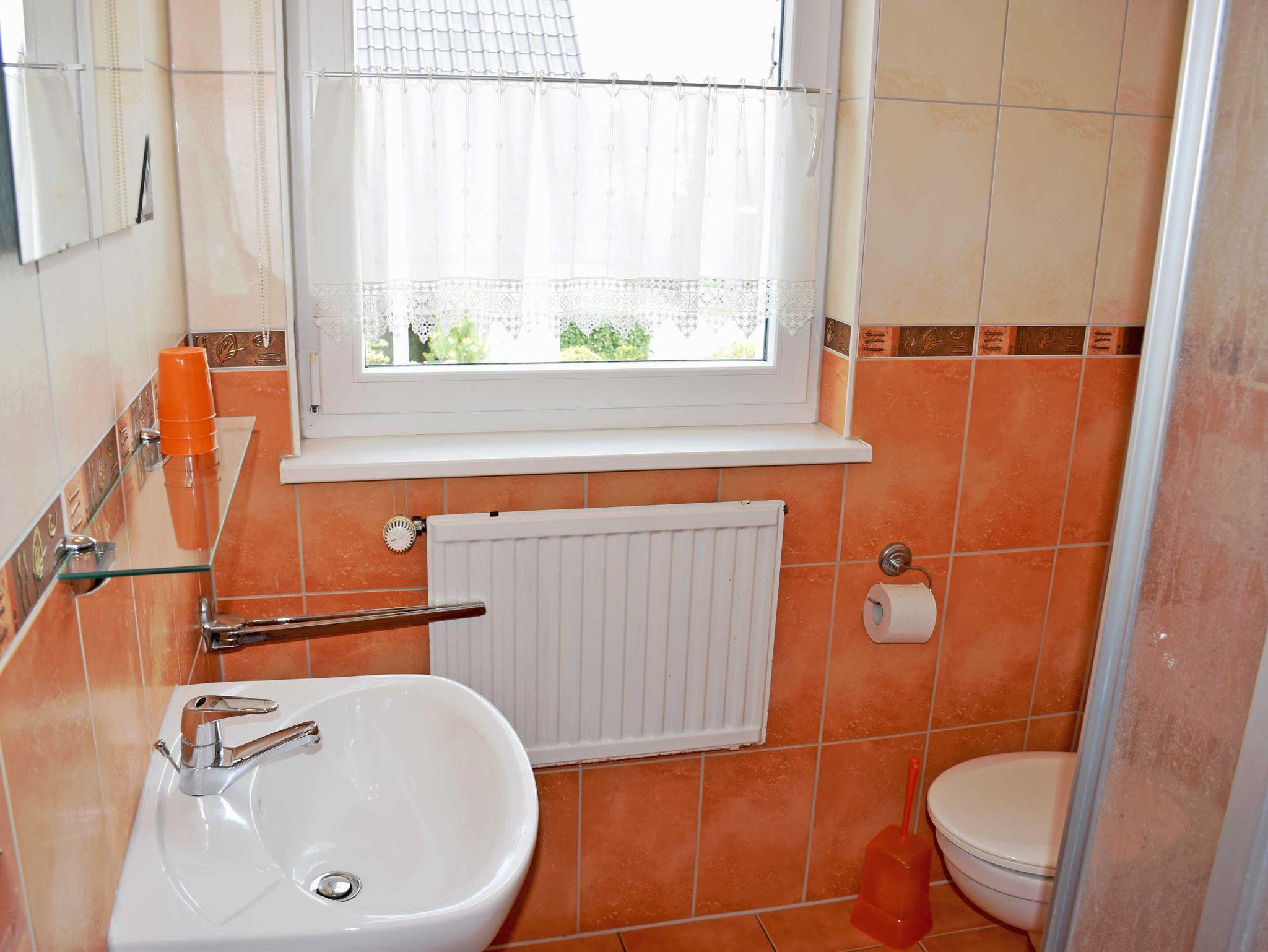 Das Bad verfügt über WC und Dusche und Tageslicht.