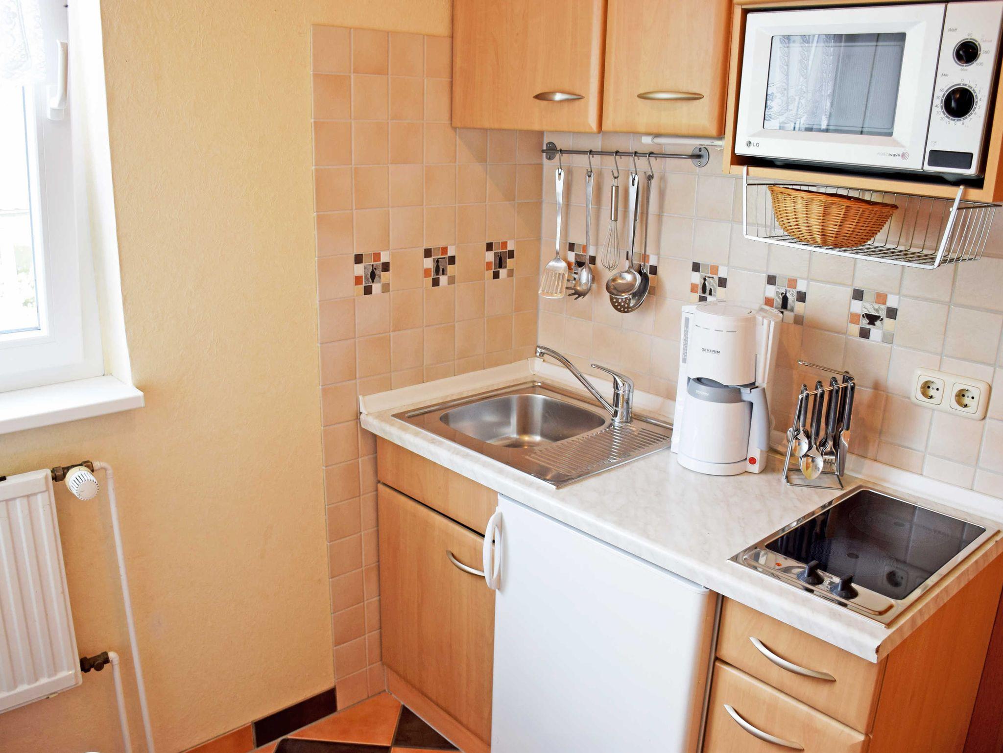 In der separaten Küche stehen ein kleiner Esstisch mit Stühlen und eine Küchenzeile. Die Küchenzeile ist mit einem Herd, Mikrowelle, Wasserkocher, Kaffeemaschine, Toaster, Spüle und Kühlschrank ausgestattet.