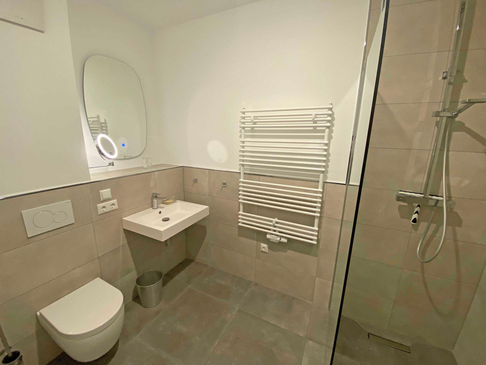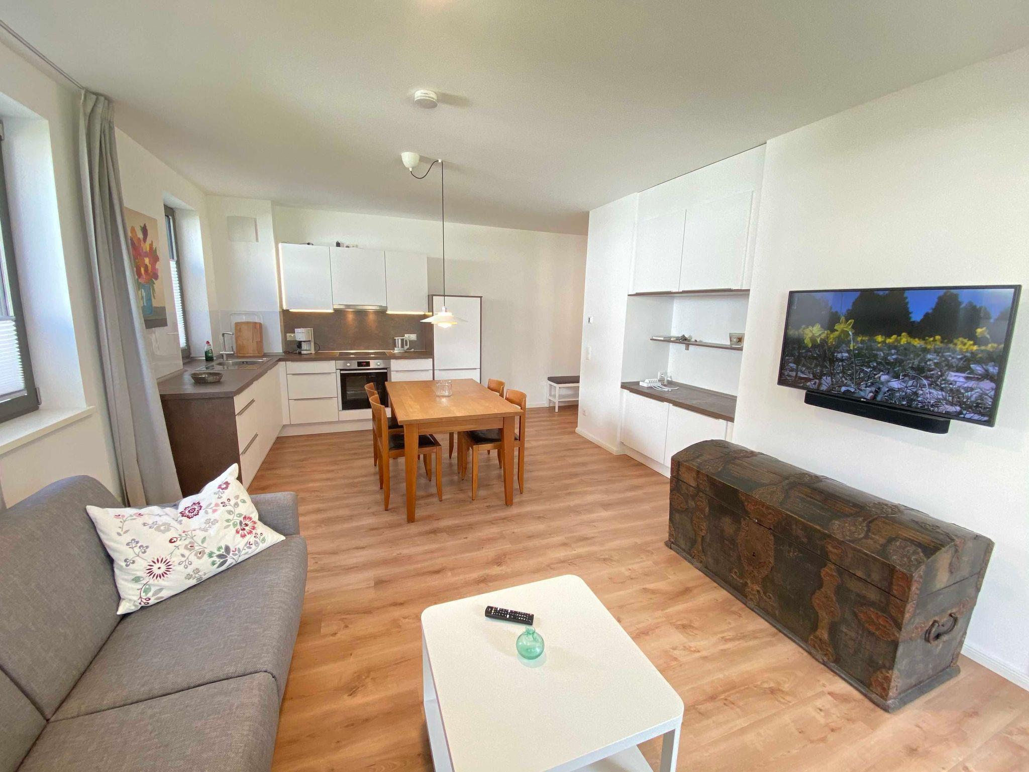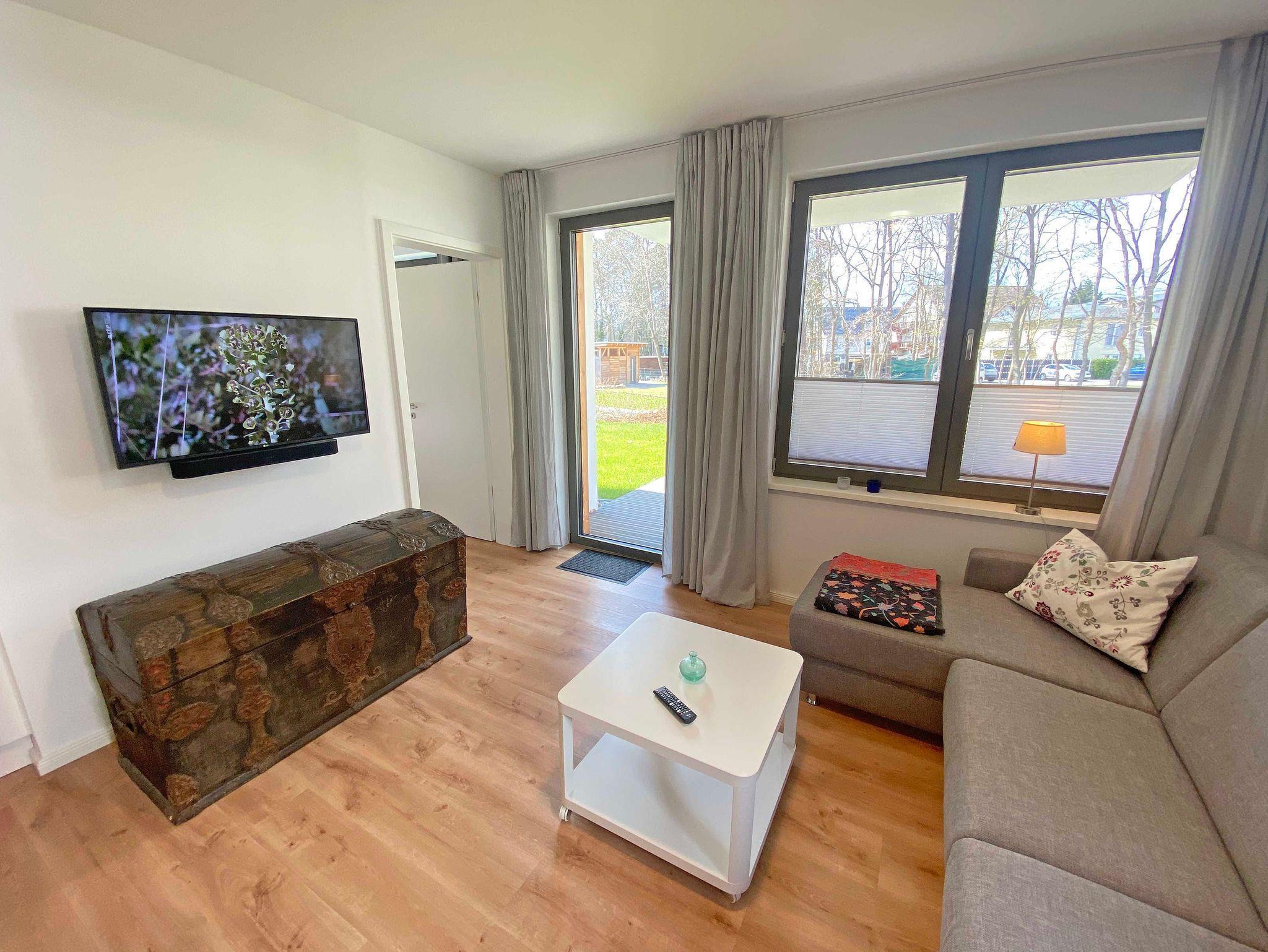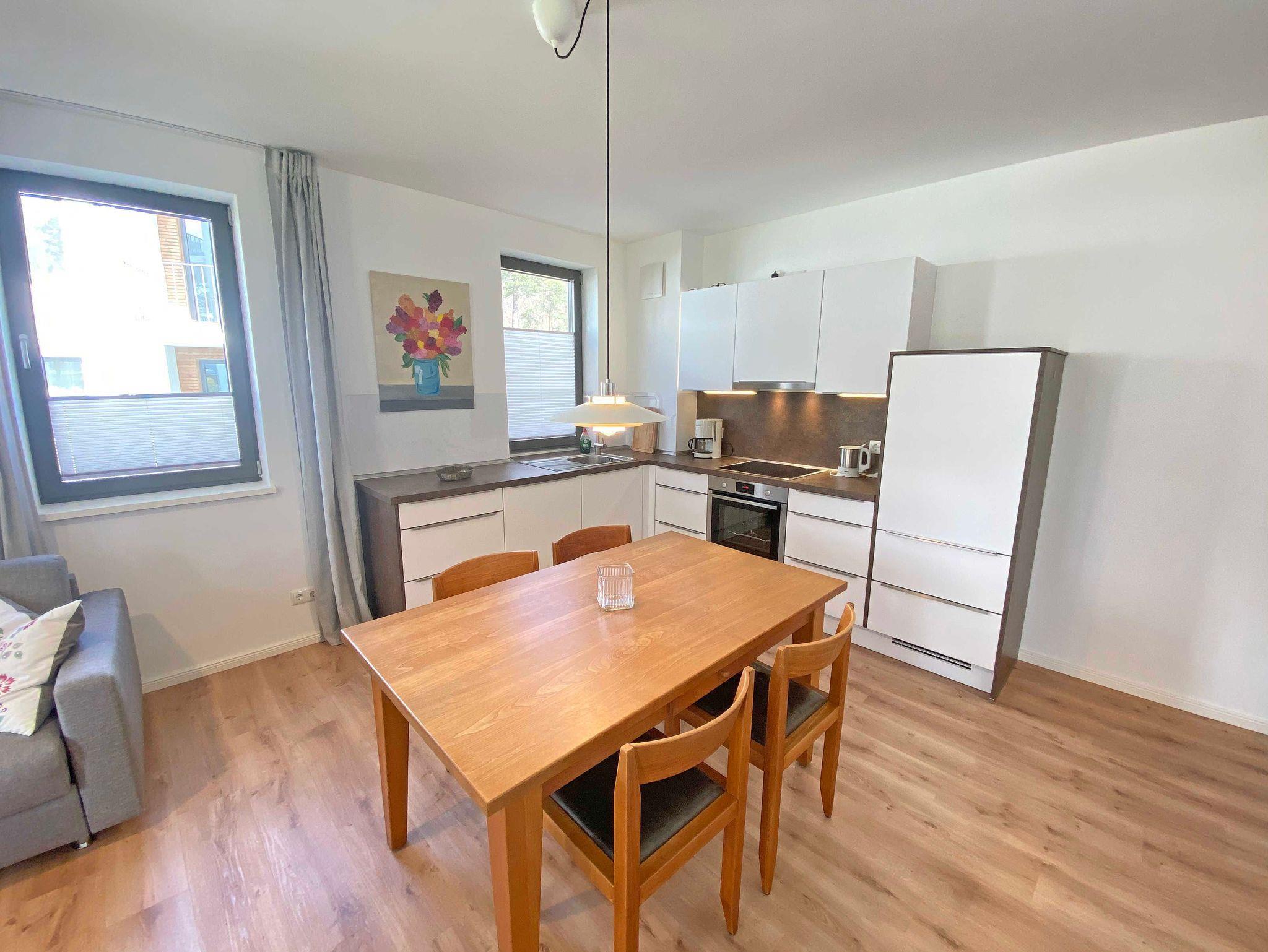 Die Nichtraucherwohnung umfasst ca. 61 m² und bietet als 2-Raumwohnung ausreichend Platz für maximal 2 bis 4 Personen. Über einen kleinen Flur mit Garderobe erreichen Sie den offenen Wohnbereich mit angrenzender Küchenzeile. Der Wohnbereich wird durch eine bequeme Couch (1,40m x 2,00m), einen mobilen Couchtisch sowie einen Smart-TV mit Denon-Soundbar abgerundet. Ein inklusiver Internetanschluss per WLAN steht Ihnen zusätzlich zur Verfügung, über das u.a. per Sono-App Musik gestreamt werden kann. Die moderne Küchenzeile mit Backofen, Kühlschrank mit Gefrierfach, Spülmaschine, Cerankochfeld, Wasserkocher, Kaffeemaschine, Espressokocher und Toaster fügt sich mit einem massiven Holzesstisch sowie lederbezogene Essstühle an. Vom Wohnbereich gelangen Sie auf Ihre bestuhlte Terrasse (Süd/West). Das Schlafzimmer wurde mit einem Boxspringbett (1,80m x 2,00m), Beistelltischen mit Nachtlicht, einen Kleiderschrank ausgestattet. Durch lichtdichte Vorhänge sowie Insektenschutzgitter steht einem angenehmen Schlaf nichts im Wege. Das innenliegende Bad verfügt über einen Waschtisch, einen beheizten und beleuchteten Spiegel, Handtuchheizung, Fön, Kosmetikspiegel, WC sowie eine große ebenerdige Klarglas-Dusche mit Regenduschkopf. Alle Räumlichkeiten sind mit einer separat regulierten Fußbodenheizung ausgestattet. Von Ihrem Tiefgaragenstellplatz (Nr.80, Einfahrtshöhe 2,15m) gelangen Sie bequem mit dem Aufzug zu Ihrer Ferienwohnung. Im Kellerraum Nr.13 haben Sie die Möglichkeit Strandgeräte, Fahrräder etc. einzuschließen. Haustiere sind nicht erlaubt. Die Erstausstattung eines Wäschepaketes (komplette Bettwäsche, 1 Duschhandtuch, 2 kleine Handtücher) können Sie bis 14 Tage vor Anreise gegen einen Aufpreis dazu buchen oder durch eigene ergänzen. Ab 2 gebuchten Paketen erhalten Sie einmalig 1 Geschirrhandtuch und 1 Duschvorleger hinzu.