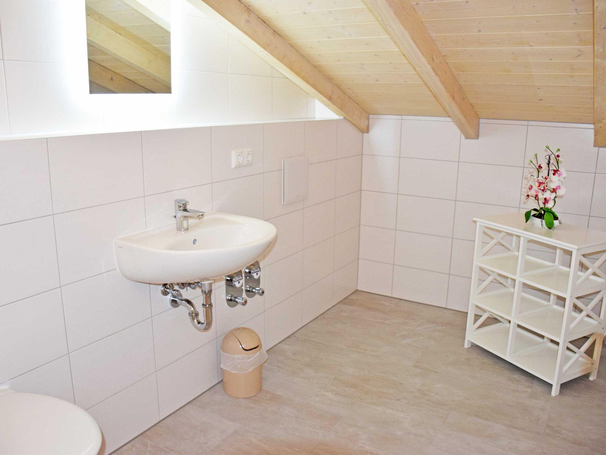 Im Flur erreicht man über eine Treppe das Obergeschoss. Hier befinden sich 2 Schlafzimmer und ein weiteres Bad mit WC und Waschbecken. Das erste Schlafzimmer ist mit einem bequemen Doppelbett (1,80m x 2,00m) mit Nachttisch und Leselampen und ein Kleiderschrank ausgestattet. Das zweite Schlafzimmer verfügt über ein Doppelbett (1,80m x 1,90m) mit Nachttischen und Leselampen sowie Kommode.