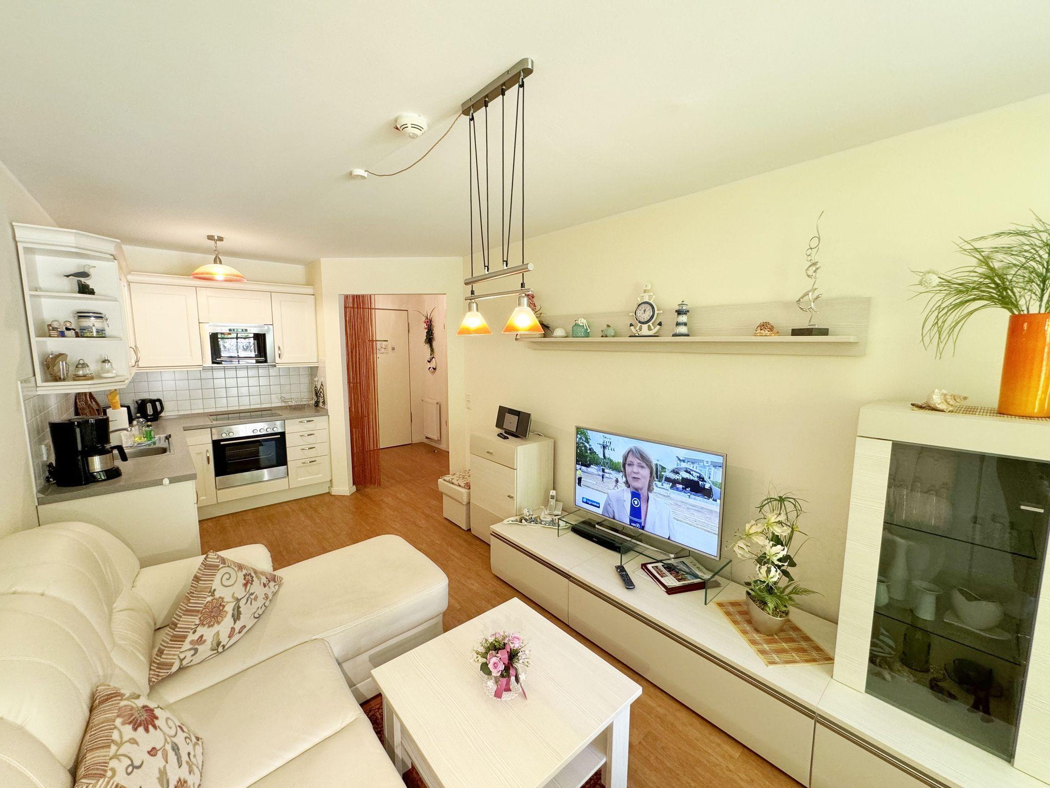 Die Nichtraucher/Ferienwohnung Strandperle (A.1.22) ist mit viel Liebe zum Detail ausgestattet und eingerichtet worden. Sie wohnen in einer ca. 41 qm 2-Zimmer Wohnung, die für max. 2 Personen ausgelegt ist. Die Wohnung Strandperle befindet sich in der 1. Etage und ist bequem per Fahrstuhl von der Tiefgarage zu erreichen. In der Wohnung finden Sie einen kombinierten Wohn/Koch- und Essbereich. Die integrierte Küchenzeile lässt mit Mikrowelle, Backofen, Ceranfeld, Spülmaschine, Kühlschrank mit Gefrierfach, Kaffeemaschine, Toaster, Wasserkocher und anderen praktischen Helfern keine Wünsche offen. Im Wohnbereich ist weiterhin eine Essecke, eine gemütliche Couch sowie ein Smart-TV, DVD-Player und ein Radio mit CD und eine Leselampe. Ein Internetanschluss (WLAN/LAN) ist für Sie inklusive. Der Balkon ist vom Wohn/Essbereich begehbar und komplett möbliert. Von hier aus schauen Sie in Richtung Kiefern und Dünen. Drei große bis zum Boden reichende Glastüren/fenster geben dem Zimmer eine besondere Note. Das Schlafzimmer ist mit einem Boxspringbett (1,80m x 2,00m), Ablagefläche und einem Kleiderschrank sowie Insektenschutzgitter ausgestattet. Das Bad verfügt über eine ebenerdige Dusche, Waschbecken, WC, Haarfön, Kosmetikspiegel und Handtuchheizkörper. Eine kleine Abstellkammer finden Sie im Flurbereich. Ein eigener PKW-Stellplatz (Nr.30, Einfahrtshöhe 2,00m) befindet sich in der Tiefgarage des Hauses. Im Keller des Hauses haben Sie die Möglichkeit eine Waschmaschine/Trockner gegen Gebühr zu nutzen. Mit dem Fahrstuhl des Hauses A gelangen sie in das Untergeschoss der Meeresblickanlage, wo Sie ein großzügiger und heller Wellnessbereich erwartet. Hier können sie in einem Pool kleine Bahnen schwimmen, in 2 Saunen Ihren Kreislauf in Schwung bringen, in einem dazugehörigen Ruheraum Ihren Körper wieder beruhigen, in einer Schneckendusche sowie weiteren Duschen das kühle Nass genießen und auf einer Außenterrasse mit Außendusche die frische Luft einatmen. Die Erstausstattung von einem Wäschepaket (die komplette Bettwäsche, 1 Duschhandtuch, 2 kleine Handtücher) ist im Mietpreis ab 7 Nächten pro Person inbegriffen. Bei einer Belegung unter 7 Nächten können Sie diese durch Eigenmitnahme ergänzen bzw. bis 14 Tage vor Anreise gegen einen Aufpreis dazu buchen. Ab 2 Wäschepaketen erhalten Sie einmalig 1 Geschirrhandtuch und 1 Duschvorleger hinzu. Haustiere sind nicht erlaubt.