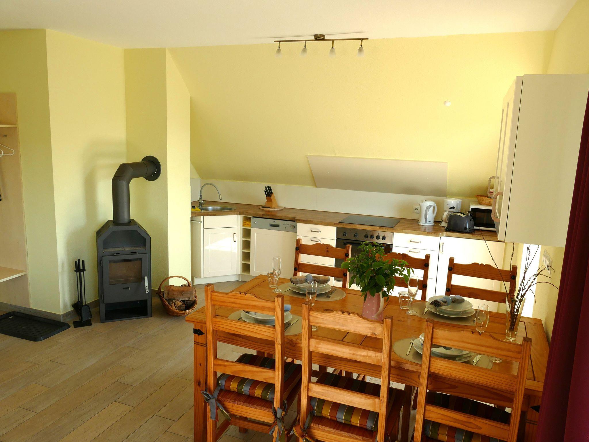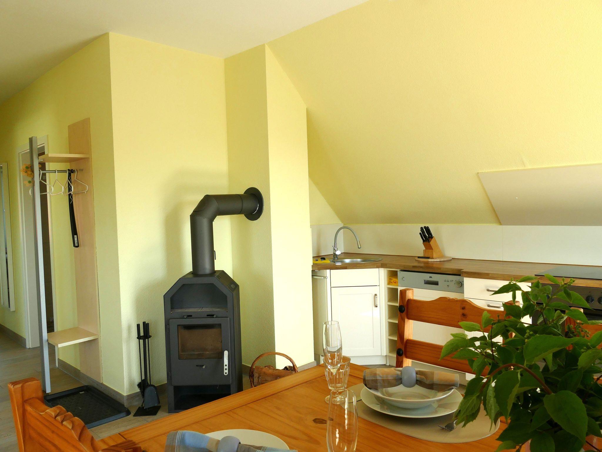 Empfangen werden Sie im geräumigen Wohn- und Essbereich der Ferienwohnung, der mit einem Kamin (Holz inklusive/kostenlos), einer gemütlichen Sitzgruppe sowie einem Esstisch für 6 Personen zum Verweilen einlädt. Der Fernseher mit DVD-Player, Radio, W-LAN (kostenlos) sowie Bücher und Spiele sorgen für exklusiven Wohnkomfort und gemütliche Abende. Aber auch der Blick aus dem übergroßen Schrägfenster auf den Selliner See mit seinen Segel- und Ruderbooten regt zum Beobachten und Träumen an.