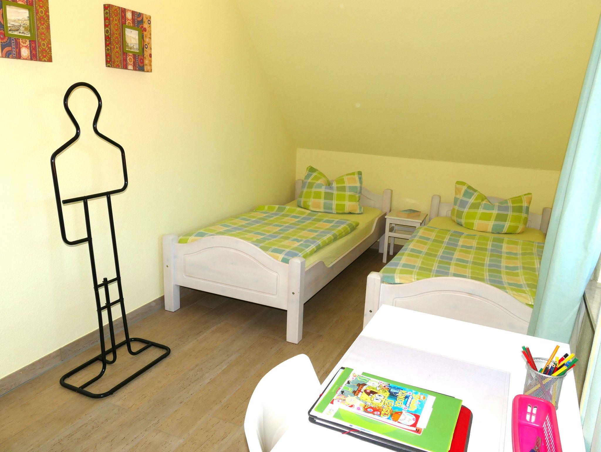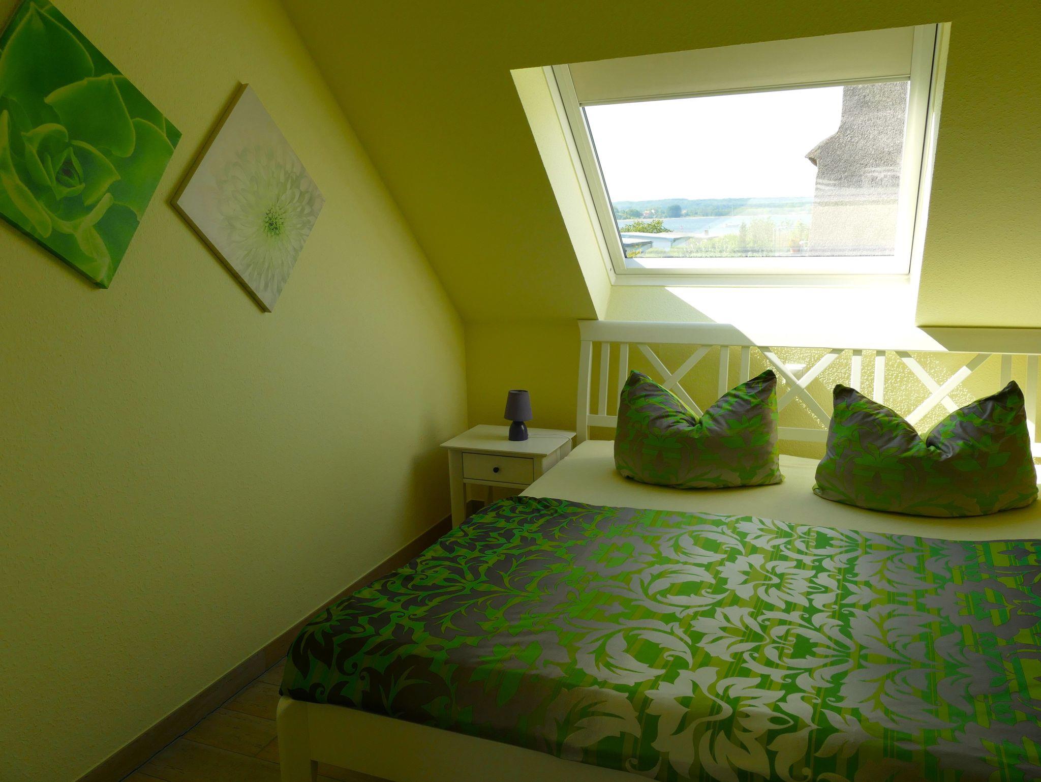 Das 1. Schlafzimmer zeigt sich mit einem Doppelbett mit verstellbaren Lattenrosten (1 x 1,80 m x 2,00 m und 1 x 1,80 m x 2,00 m), Nachtischanlagen, einem Kleiderschrank sowie einem kleinen Hocker, der zur Ablage Ihrer Kleidungsstücke dient. Der Blick durch das übergroße Schrägfenster lässt Ihren Blick ebenfalls über den Selliner See schweifen. Das Verdunklungsrollo schützt Sie vor der Helligkeit des Morgens und das Fliegengitter hält Insekten fern. Das 2. Schlafzimmer wirkt durch zwei Einzelbetten (0,90 m x 2,00 m), Nachtischanlage, einem Kleiderschrank, einem Kleiderständer, zwei Sessel mit einem kleinen Tisch, die Ihre Kleidungsstücke aufnehmen können sowie einen Schreibtisch mit Bestuhlung ganz besonders einladend. Hier verschließen Verdunklungsvorhänge das Eindringen der Sonne am frühen Morgen sowie die Fliegengitter das Eindringen von Insekten.